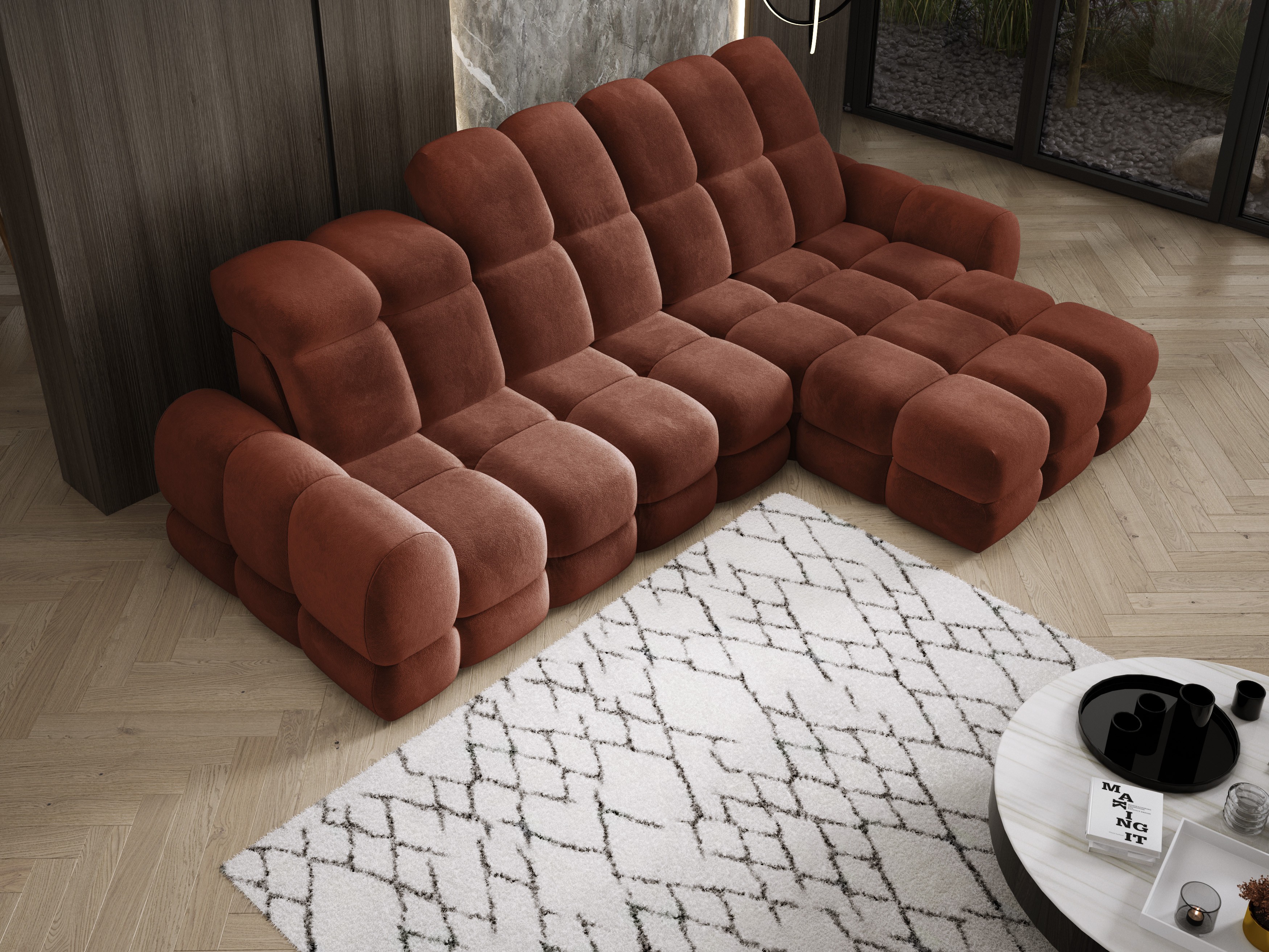 Model został wyposażony w elektrycznie rozkładaną funkcję spania, która w kilka chwil zamienia narożnik w komfortowe łóżko – idealne do codziennego relaksu lub dla gości.