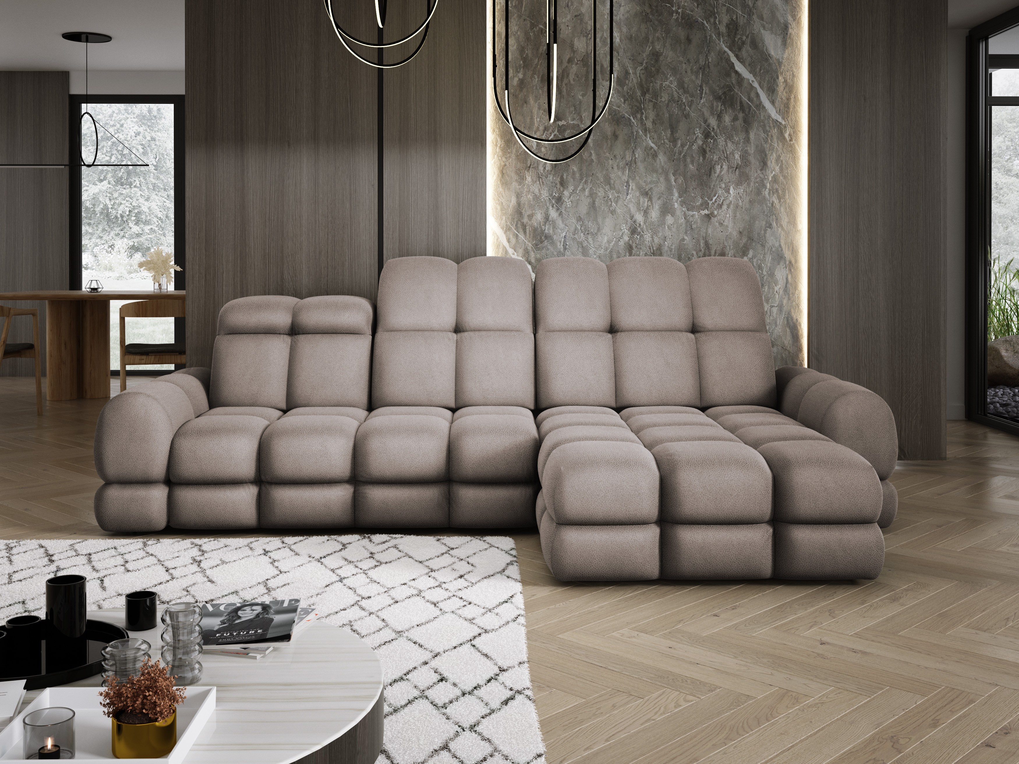 Model został wyposażony w elektrycznie rozkładaną funkcję spania, która w kilka chwil zamienia narożnik w komfortowe łóżko – idealne do codziennego relaksu lub dla gości.