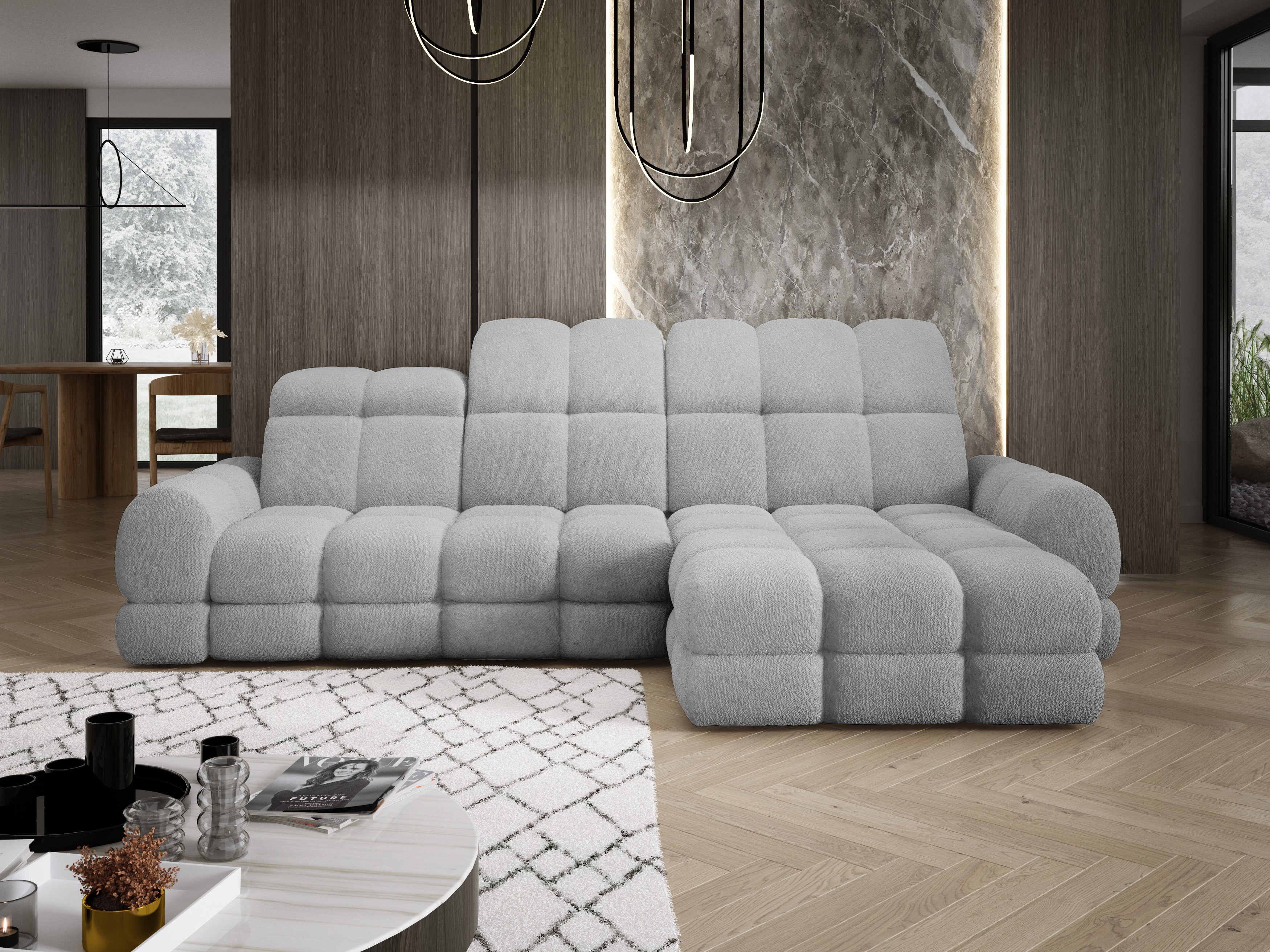 Model został wyposażony w elektrycznie rozkładaną funkcję spania, która w kilka chwil zamienia narożnik w komfortowe łóżko – idealne do codziennego relaksu lub dla gości.