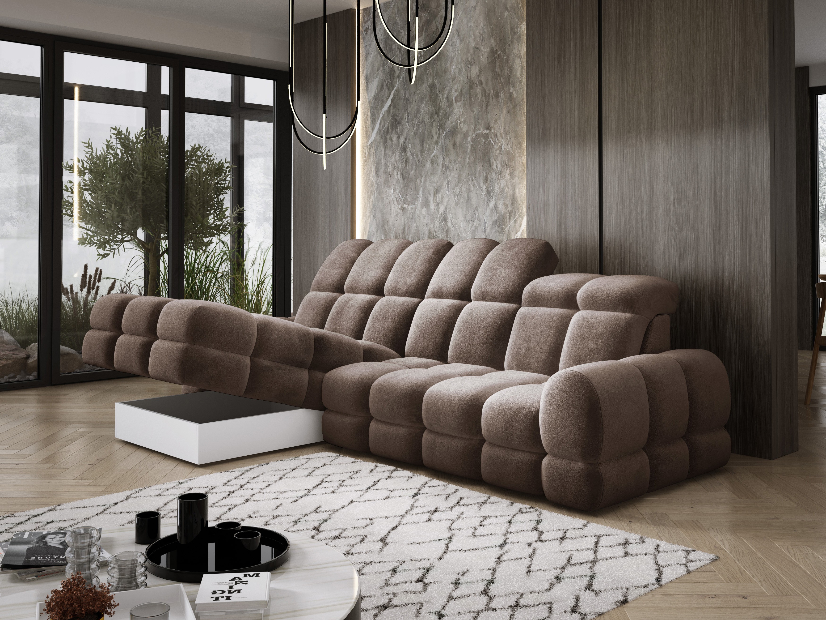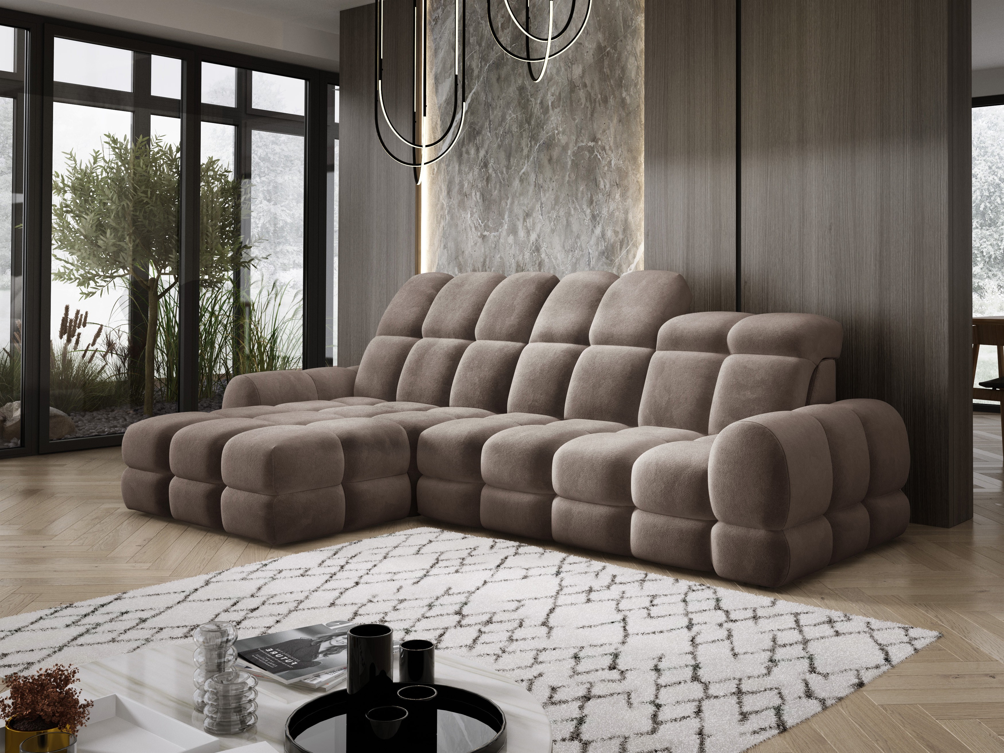 Model został wyposażony w elektrycznie rozkładaną funkcję spania, która w kilka chwil zamienia narożnik w komfortowe łóżko – idealne do codziennego relaksu lub dla gości.