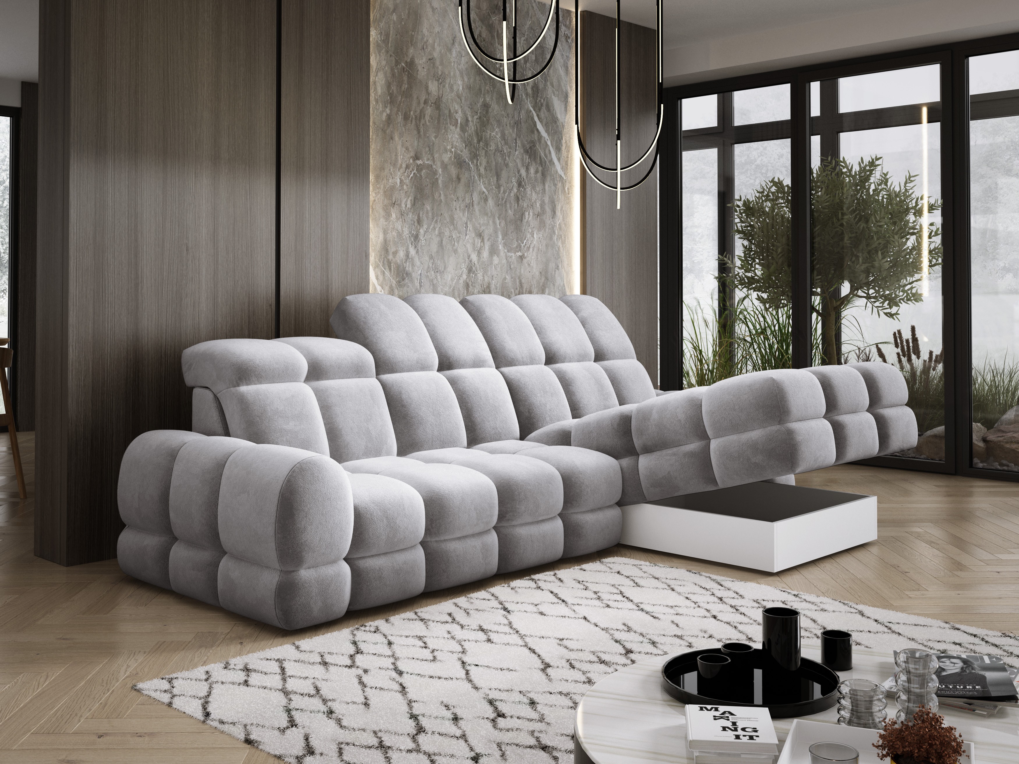 Model został wyposażony w elektrycznie rozkładaną funkcję spania, która w kilka chwil zamienia narożnik w komfortowe łóżko – idealne do codziennego relaksu lub dla gości.