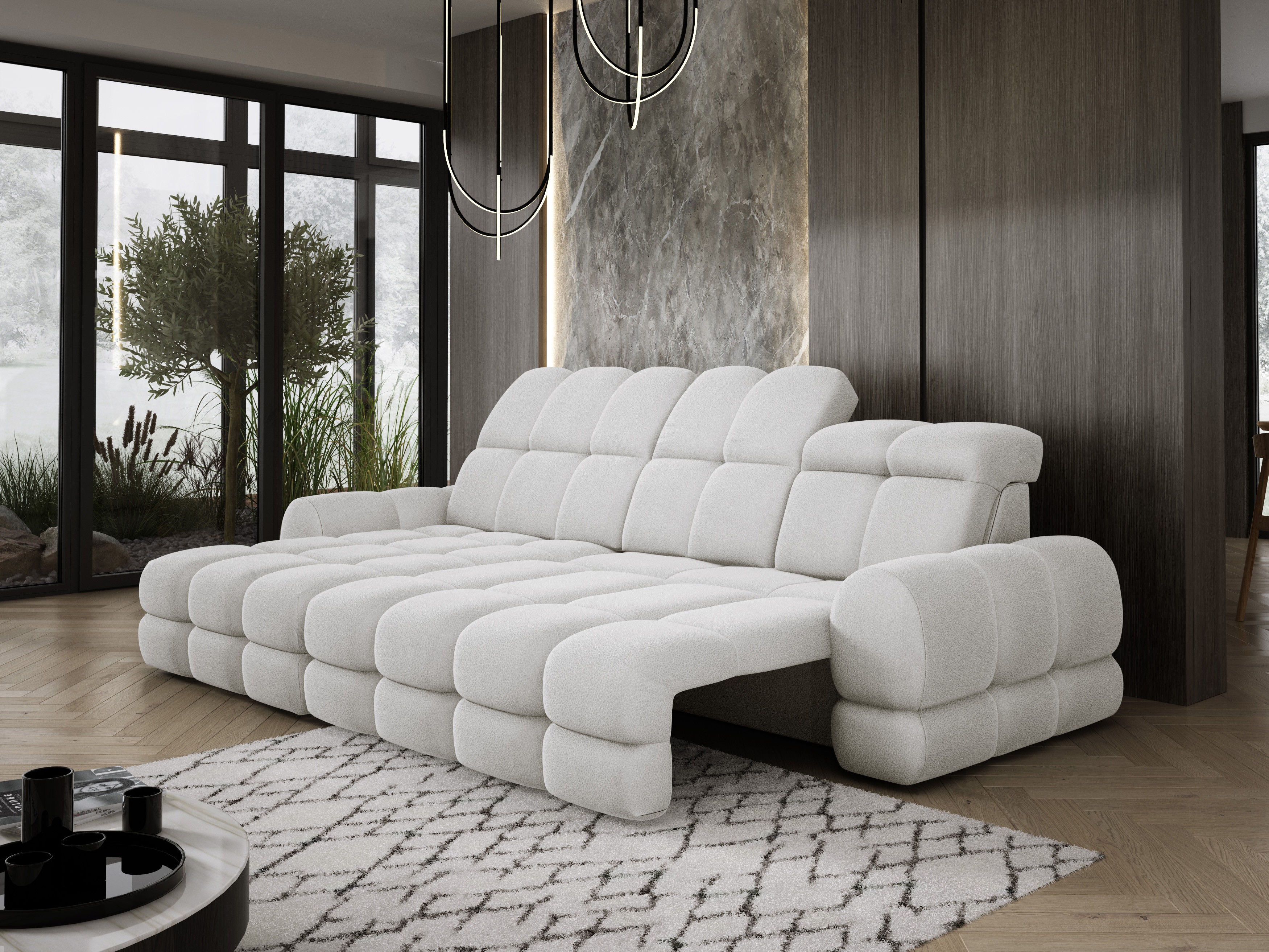 Model został wyposażony w elektrycznie rozkładaną funkcję spania, która w kilka chwil zamienia narożnik w komfortowe łóżko – idealne do codziennego relaksu lub dla gości.