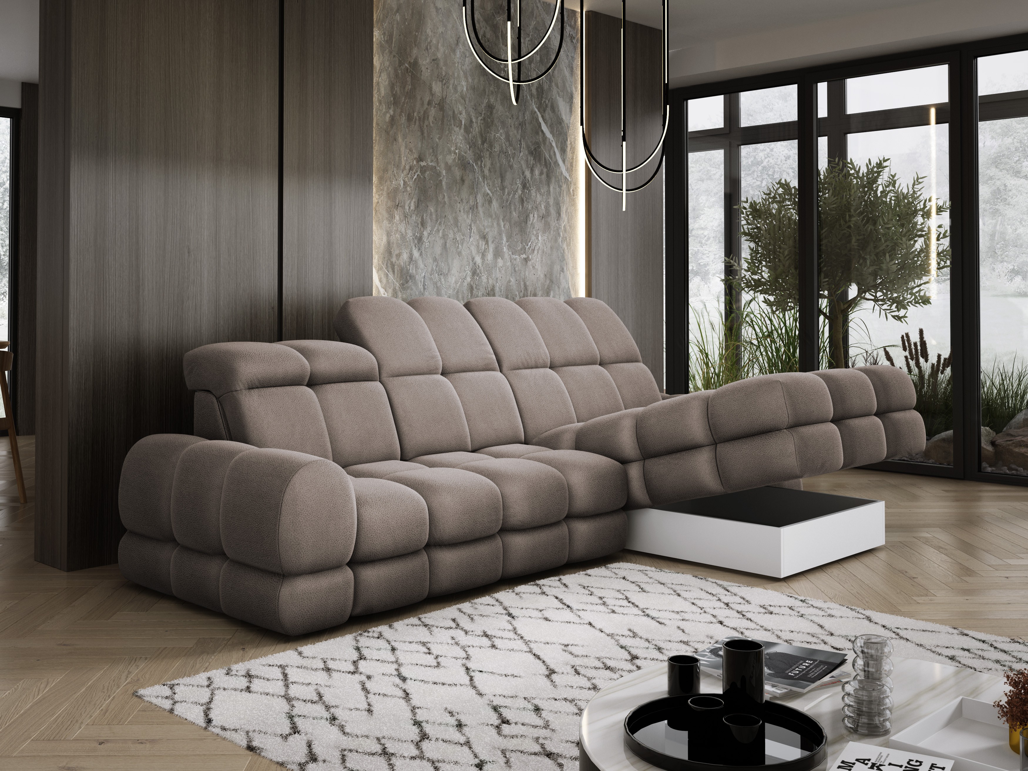 Model został wyposażony w elektrycznie rozkładaną funkcję spania, która w kilka chwil zamienia narożnik w komfortowe łóżko – idealne do codziennego relaksu lub dla gości.