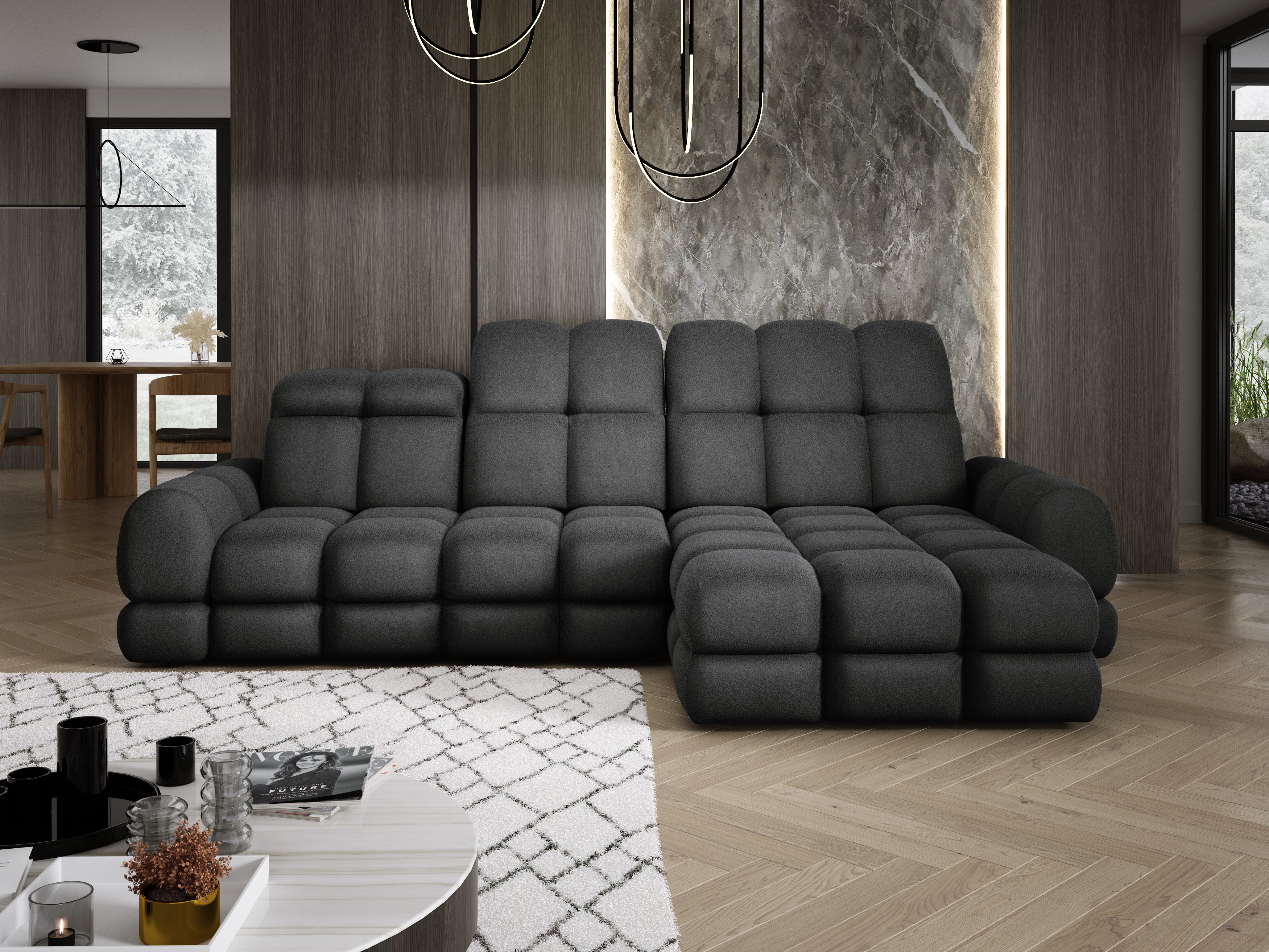 Bardzo dobrze łączy się z meblami o nowoczesnych kształtach wprowadzając do wnętrza wyjątkową, elegancką atmosferę.