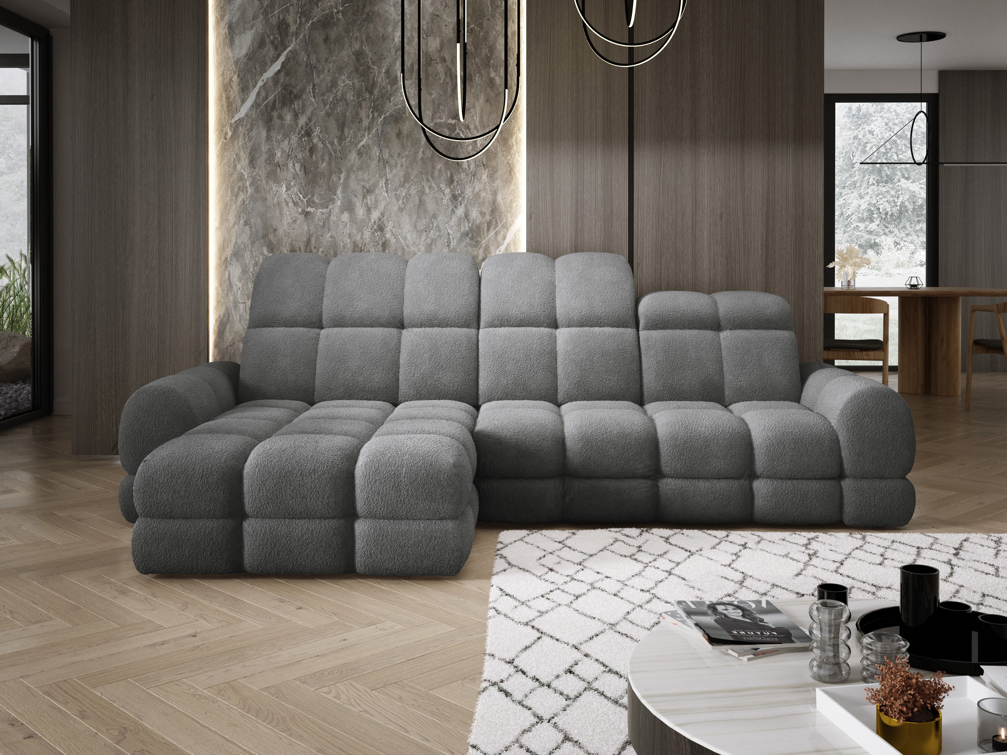 Model został wyposażony w elektrycznie rozkładaną funkcję spania, która w kilka chwil zamienia narożnik w komfortowe łóżko – idealne do codziennego relaksu lub dla gości.