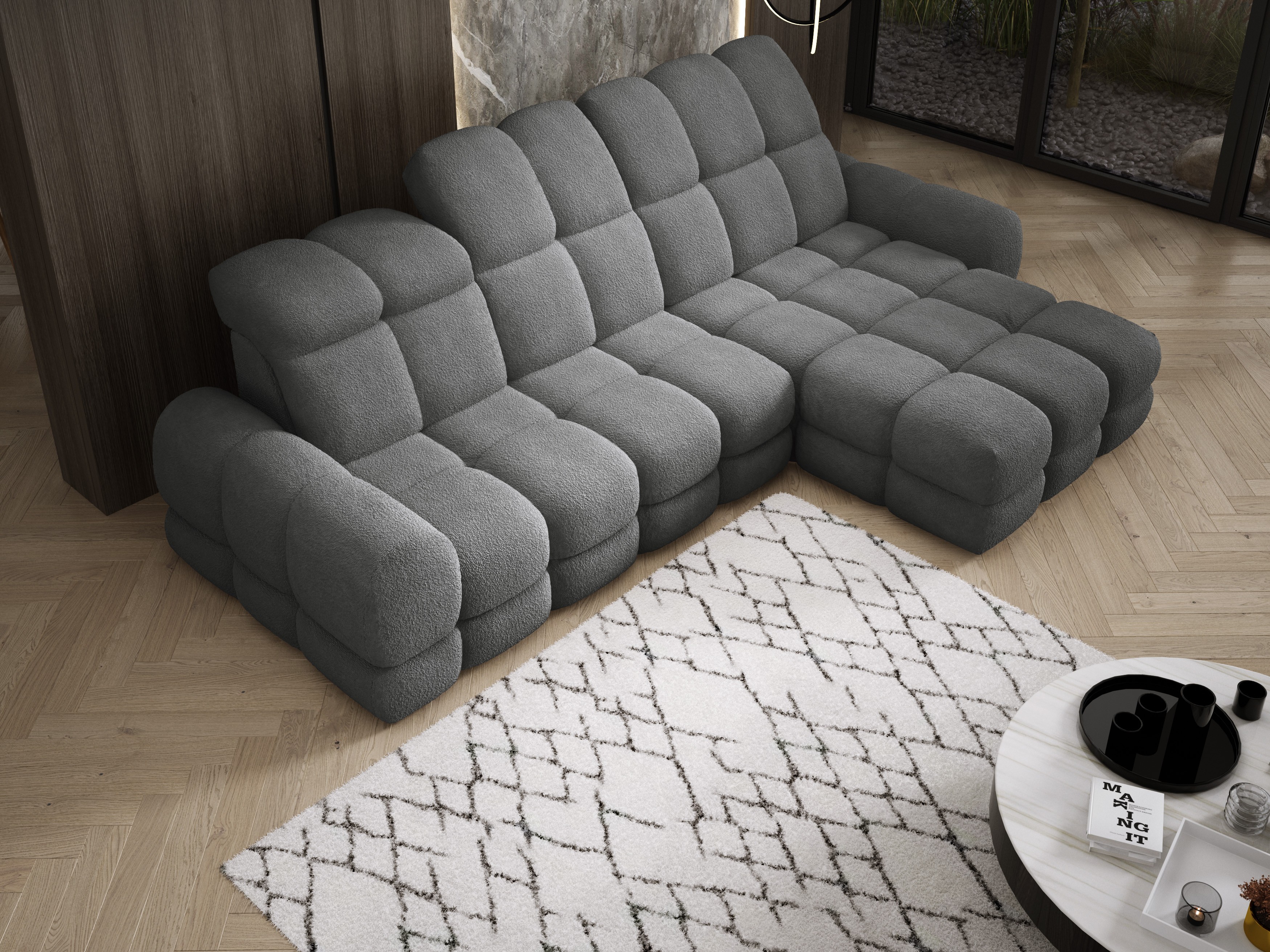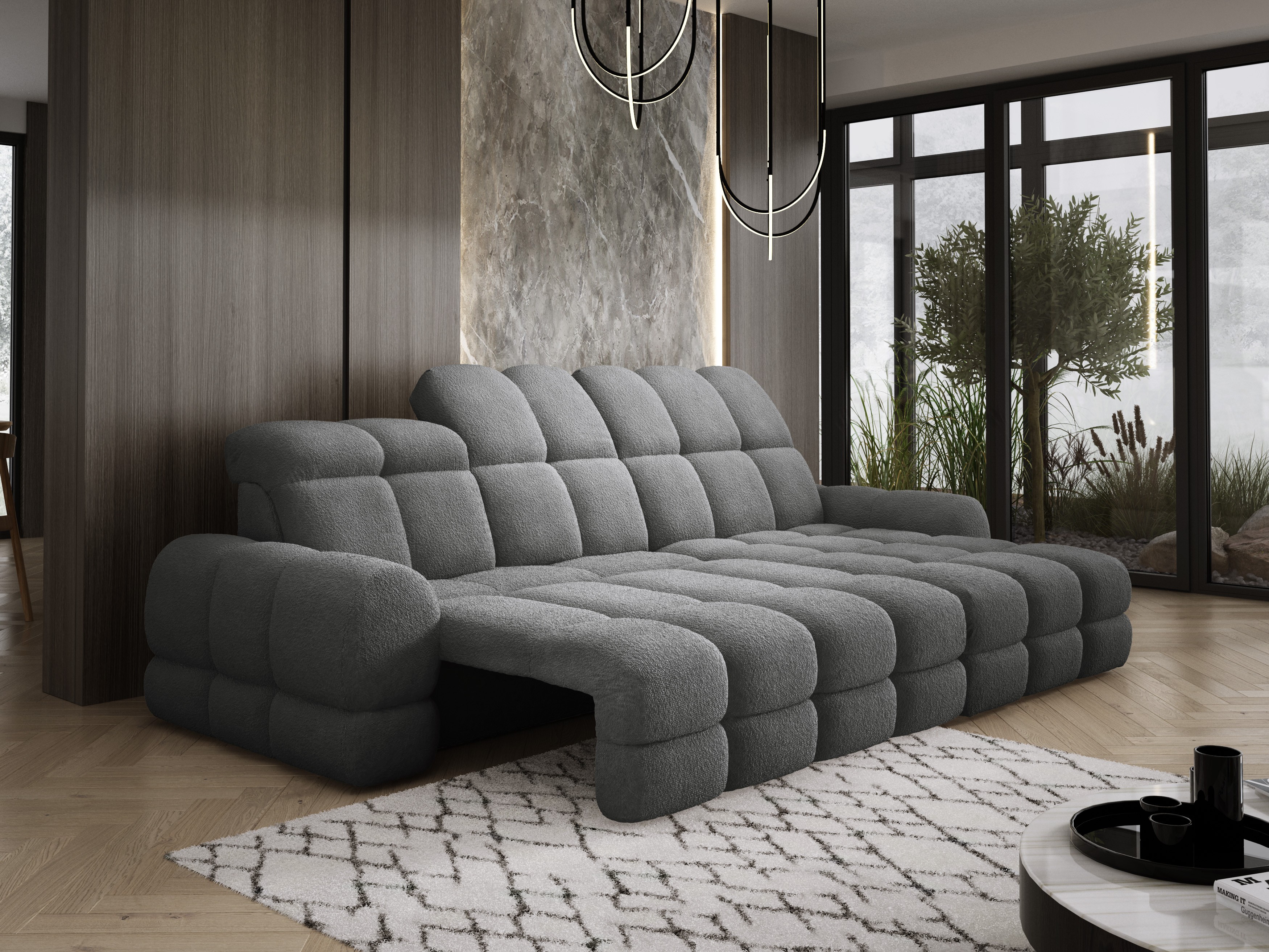 Model został wyposażony w elektrycznie rozkładaną funkcję spania, która w kilka chwil zamienia narożnik w komfortowe łóżko – idealne do codziennego relaksu lub dla gości.