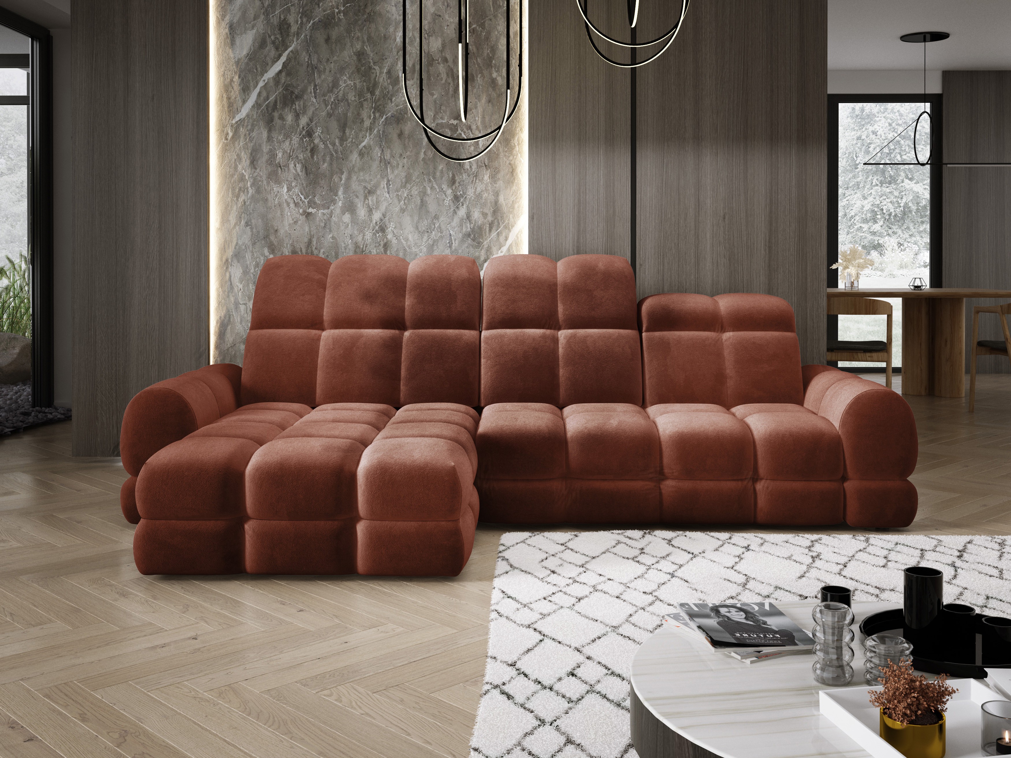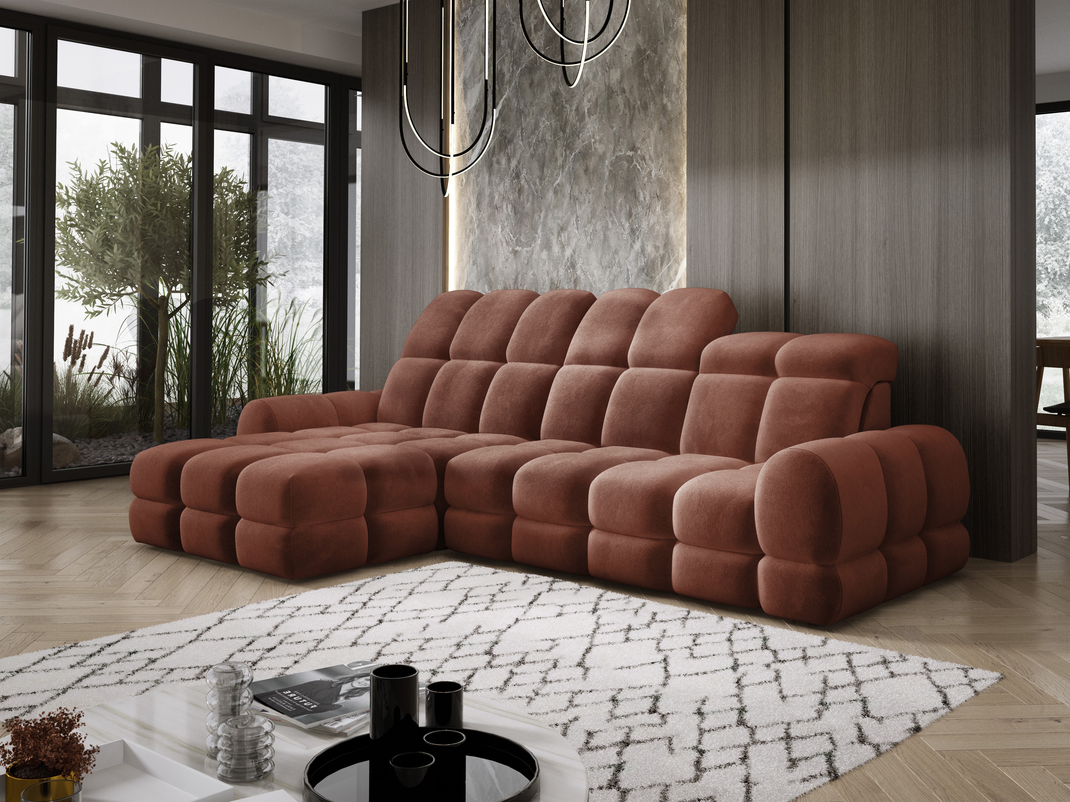 Model został wyposażony w elektrycznie rozkładaną funkcję spania, która w kilka chwil zamienia narożnik w komfortowe łóżko – idealne do codziennego relaksu lub dla gości.