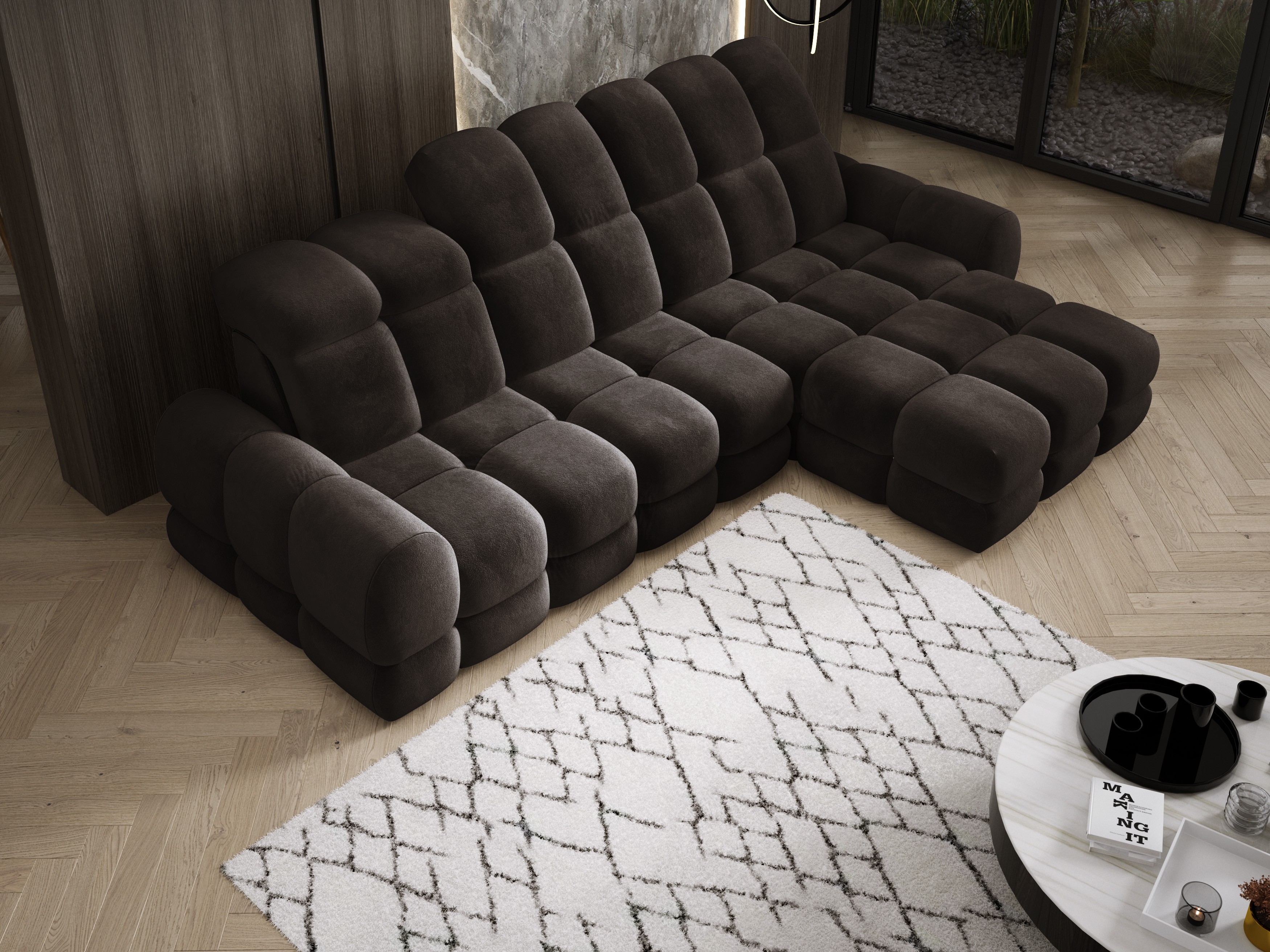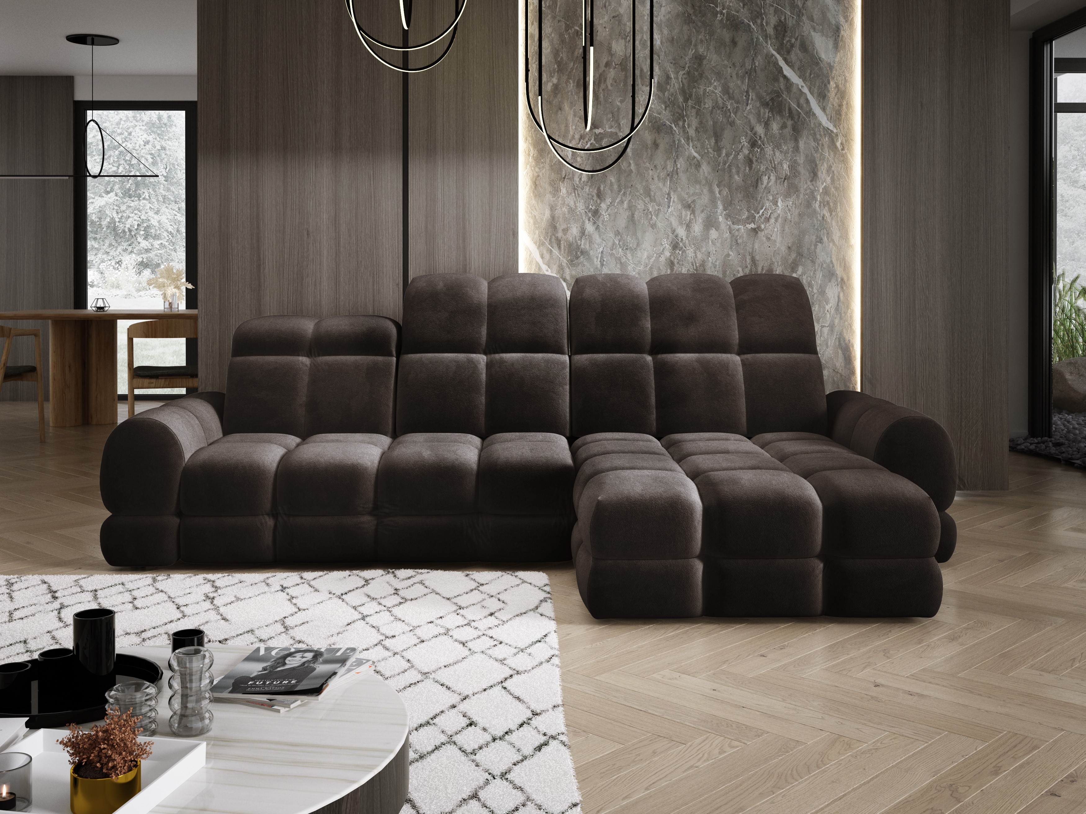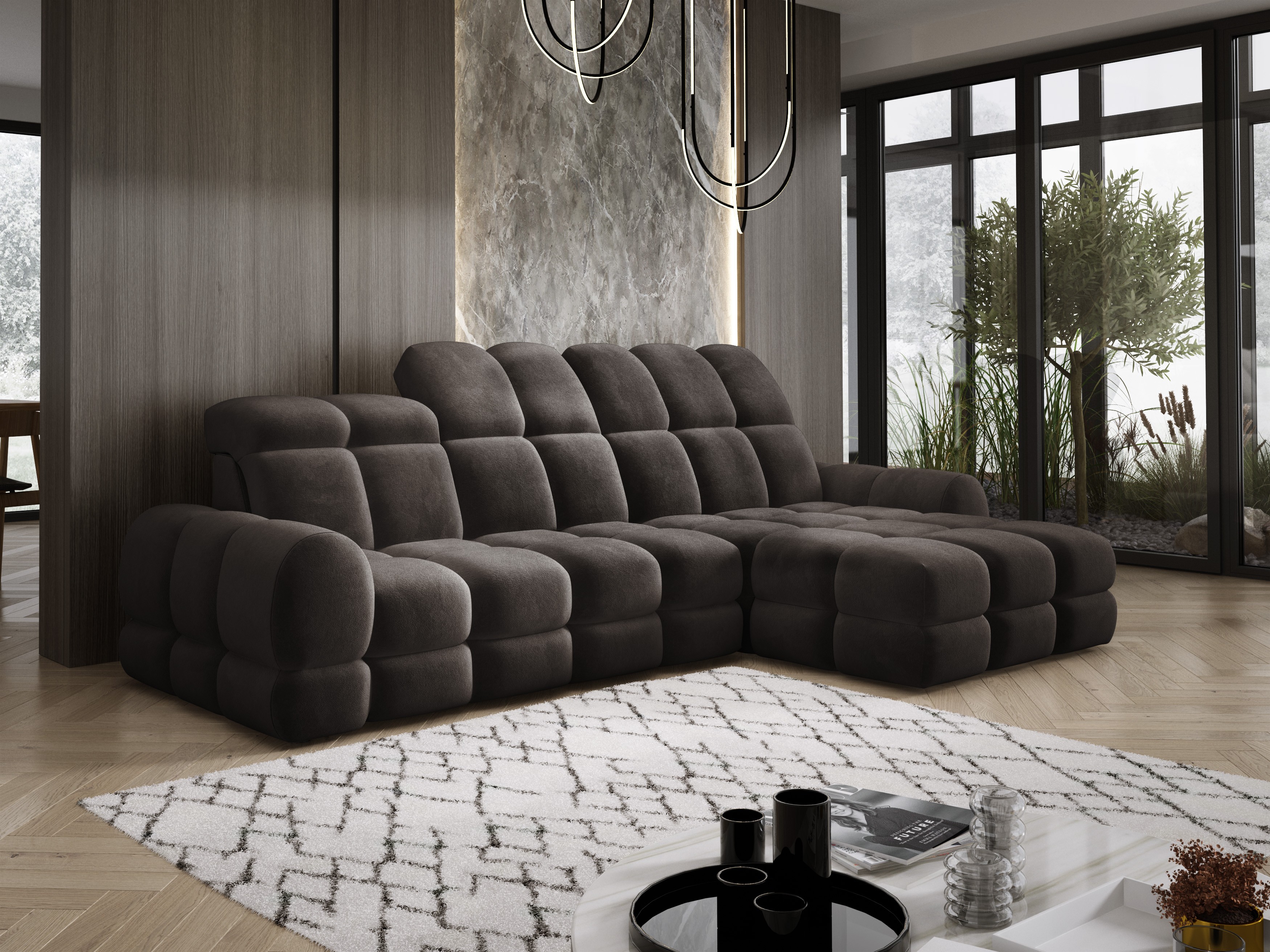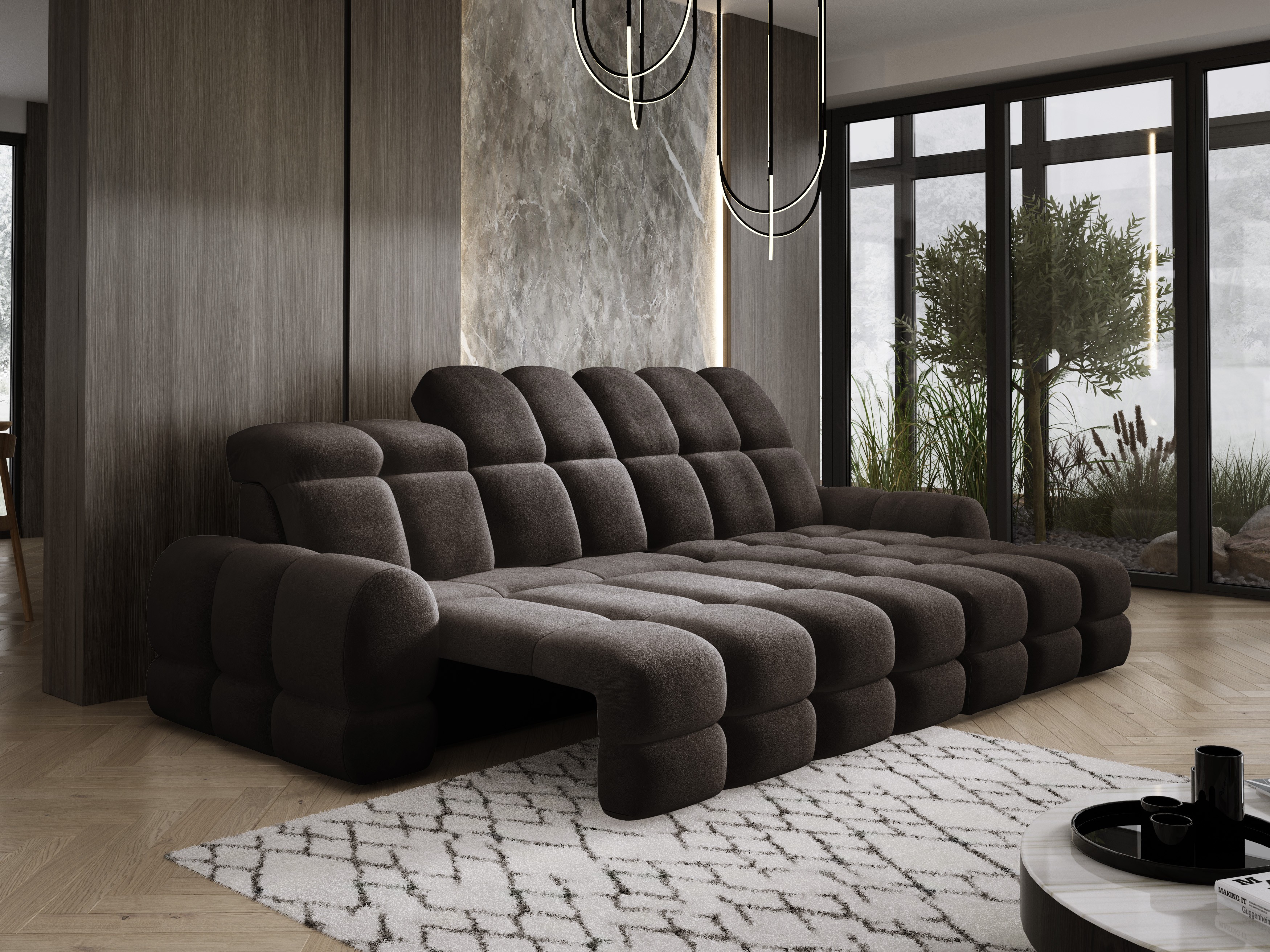 Model został wyposażony w elektrycznie rozkładaną funkcję spania, która w kilka chwil zamienia narożnik w komfortowe łóżko – idealne do codziennego relaksu lub dla gości.