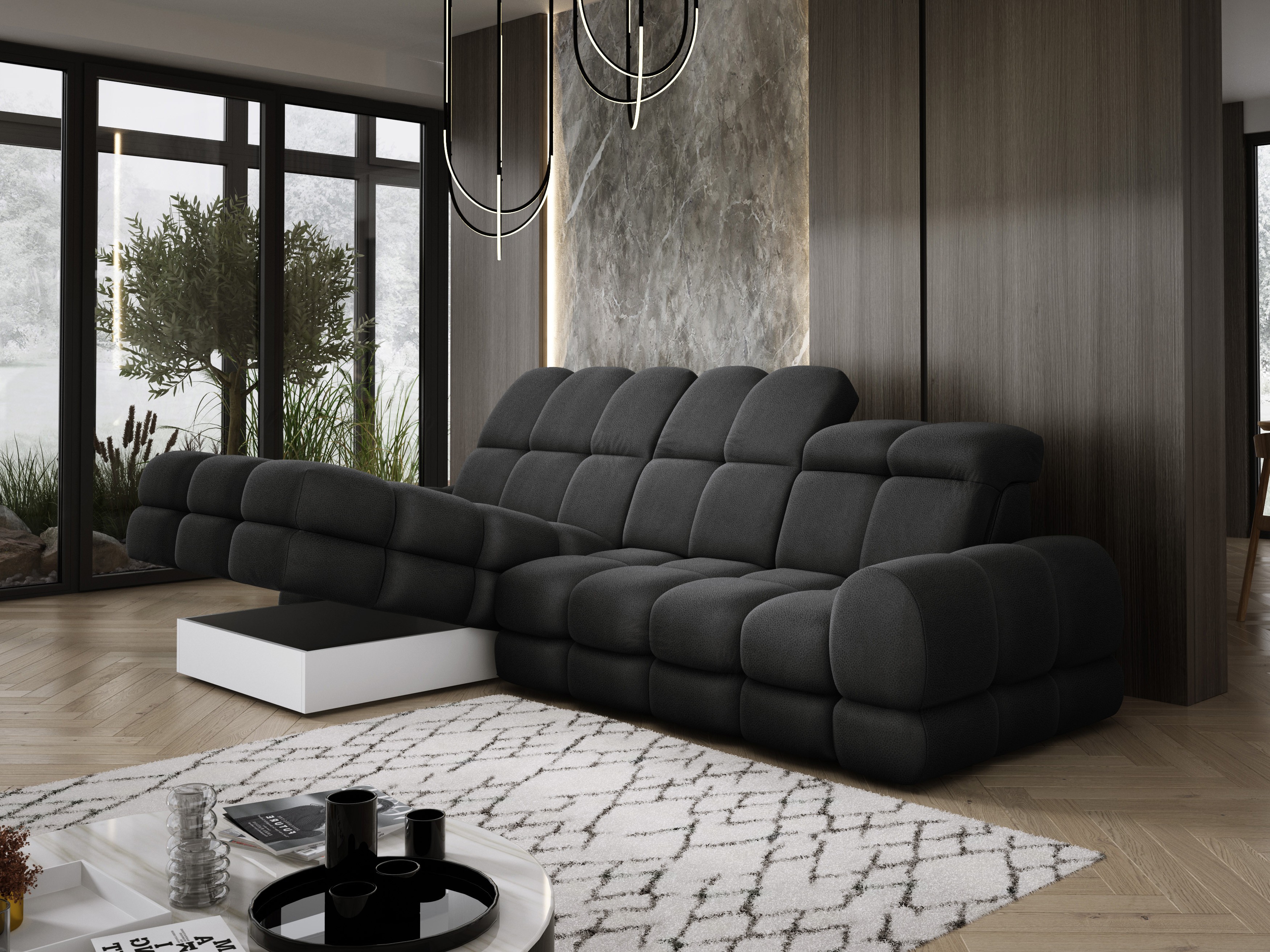 Model został wyposażony w elektrycznie rozkładaną funkcję spania, która w kilka chwil zamienia narożnik w komfortowe łóżko – idealne do codziennego relaksu lub dla gości.
