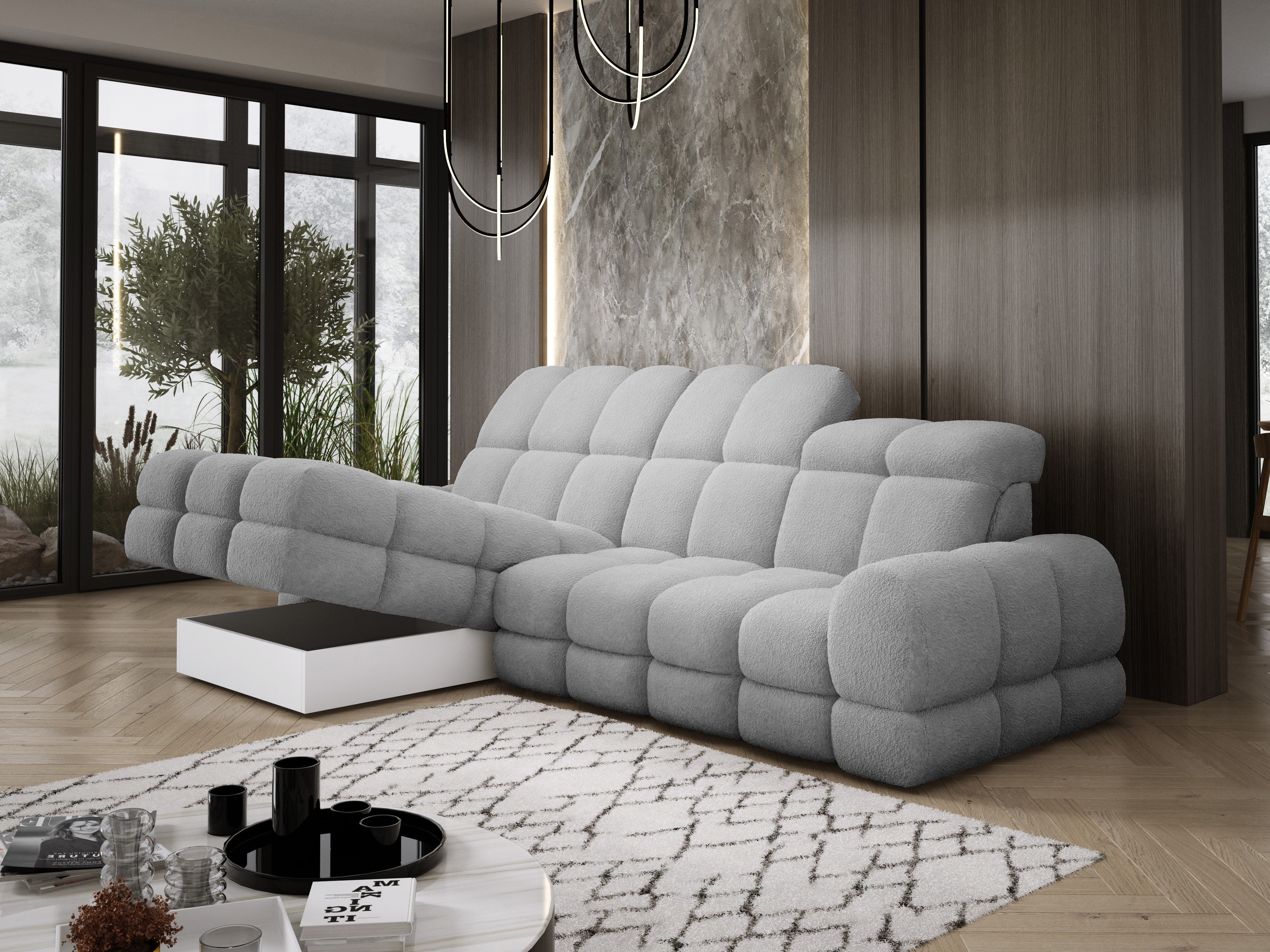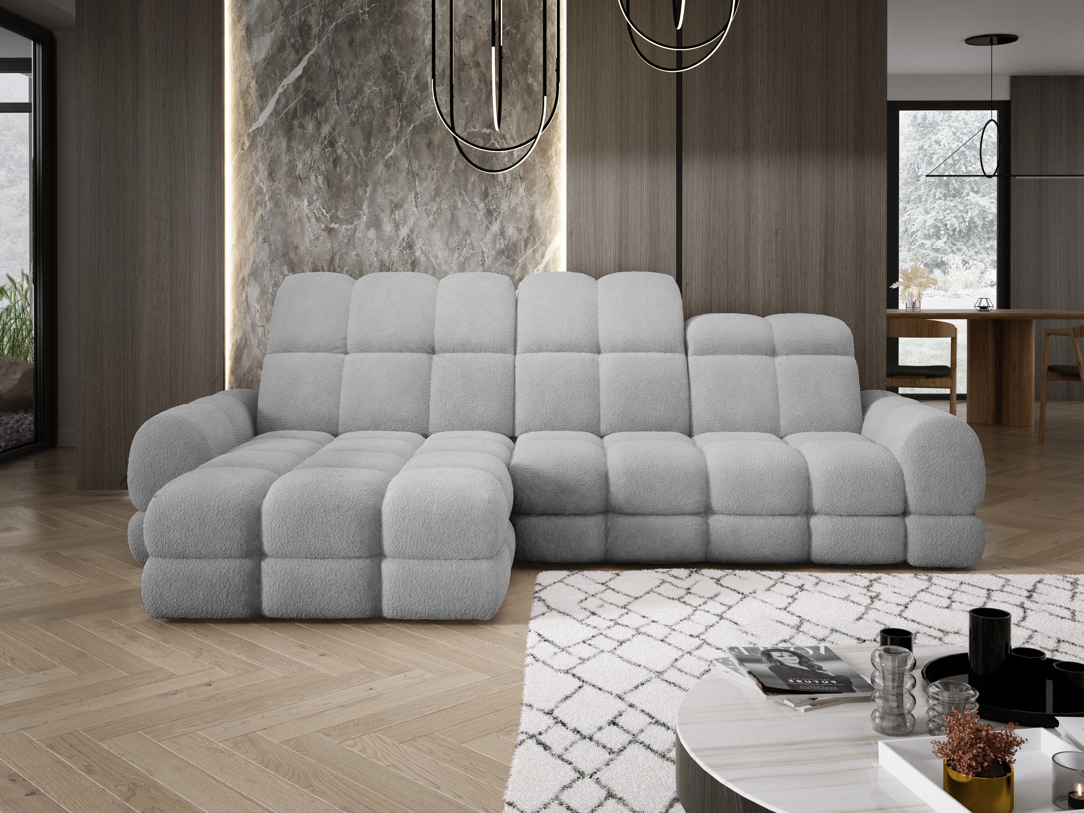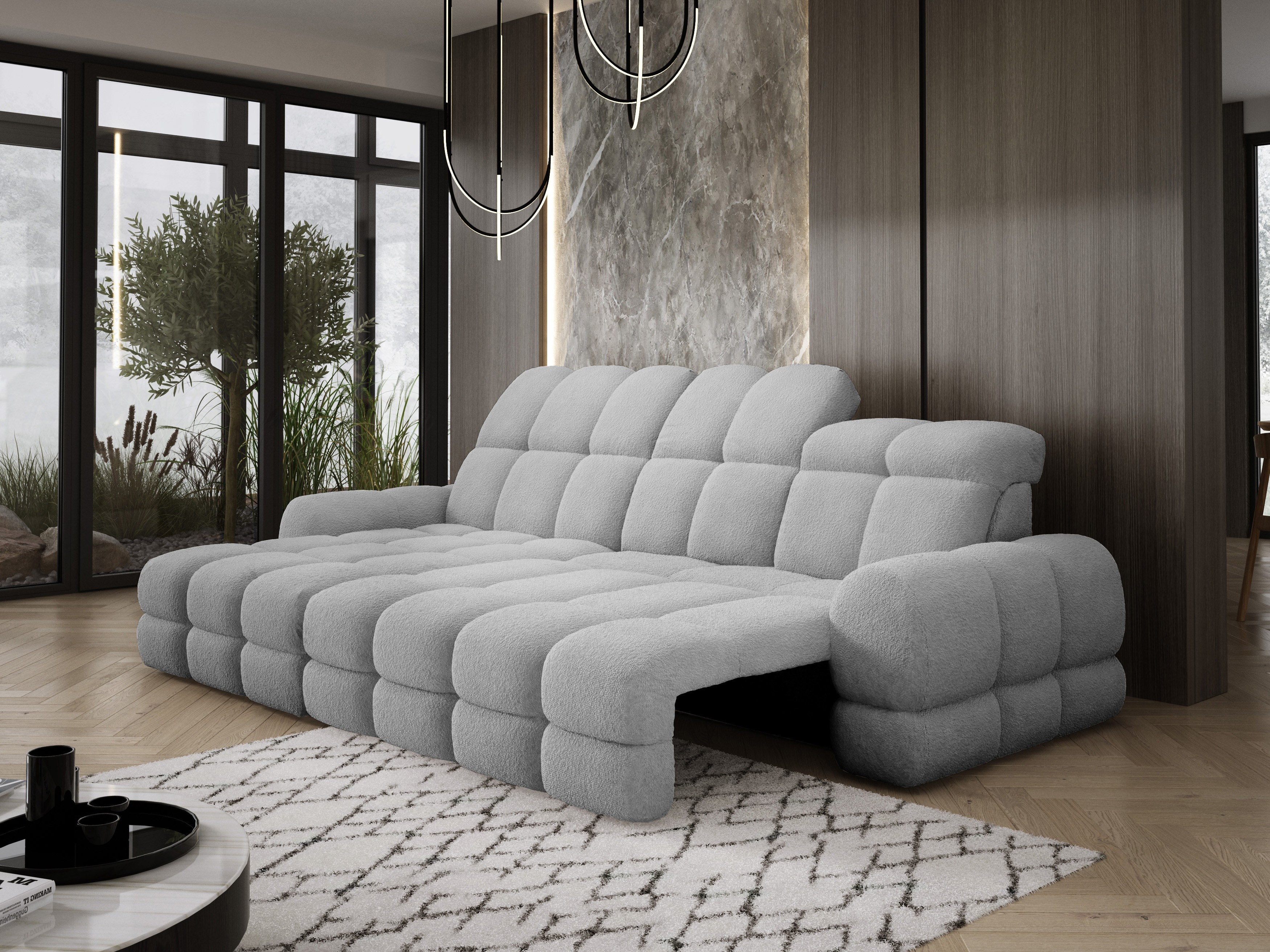 Model został wyposażony w elektrycznie rozkładaną funkcję spania, która w kilka chwil zamienia narożnik w komfortowe łóżko – idealne do codziennego relaksu lub dla gości.