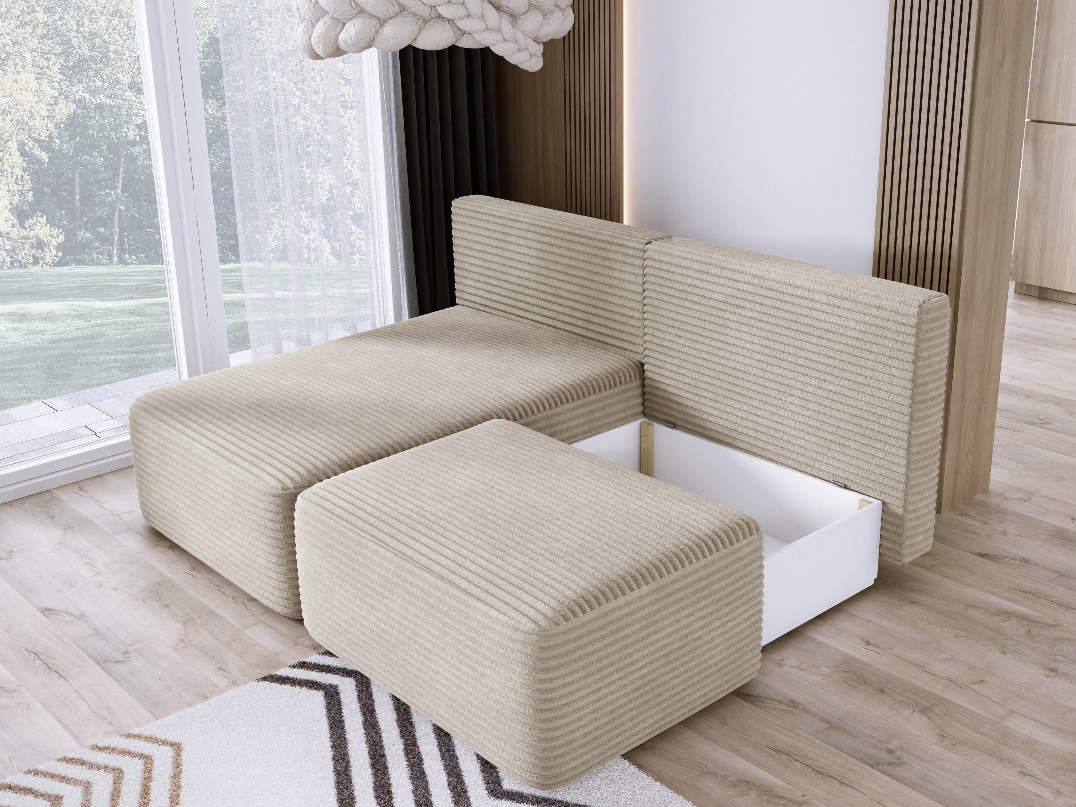 Narożnik TILIA wyposażony jest w funkcję spania DL oraz praktyczny pojemnik na pościel.
