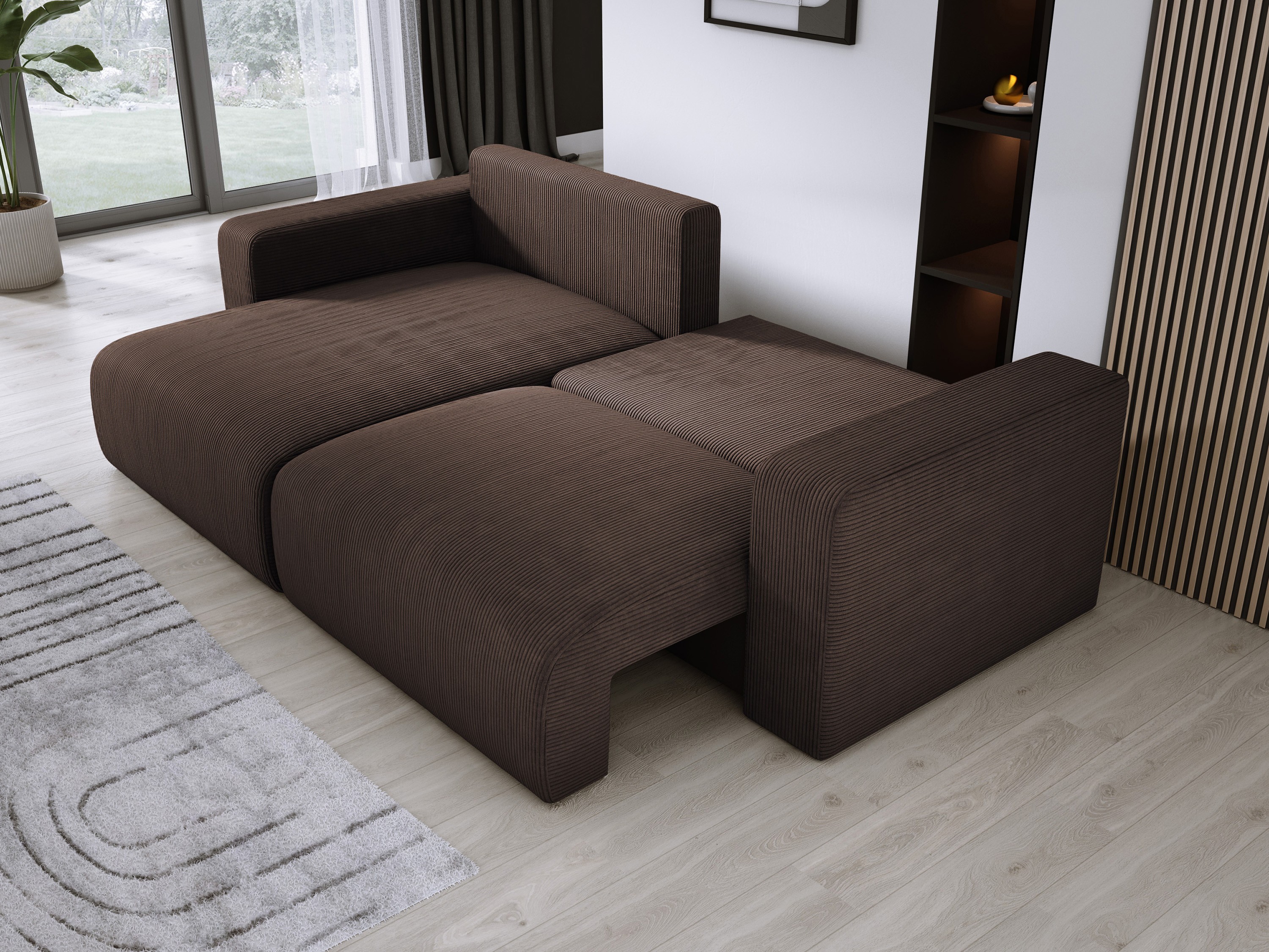 Miękkie poduchy oparciowe i wysokiej jakości obicie sztruksowe dodają mu przytulności i nowoczesnego charakteru.