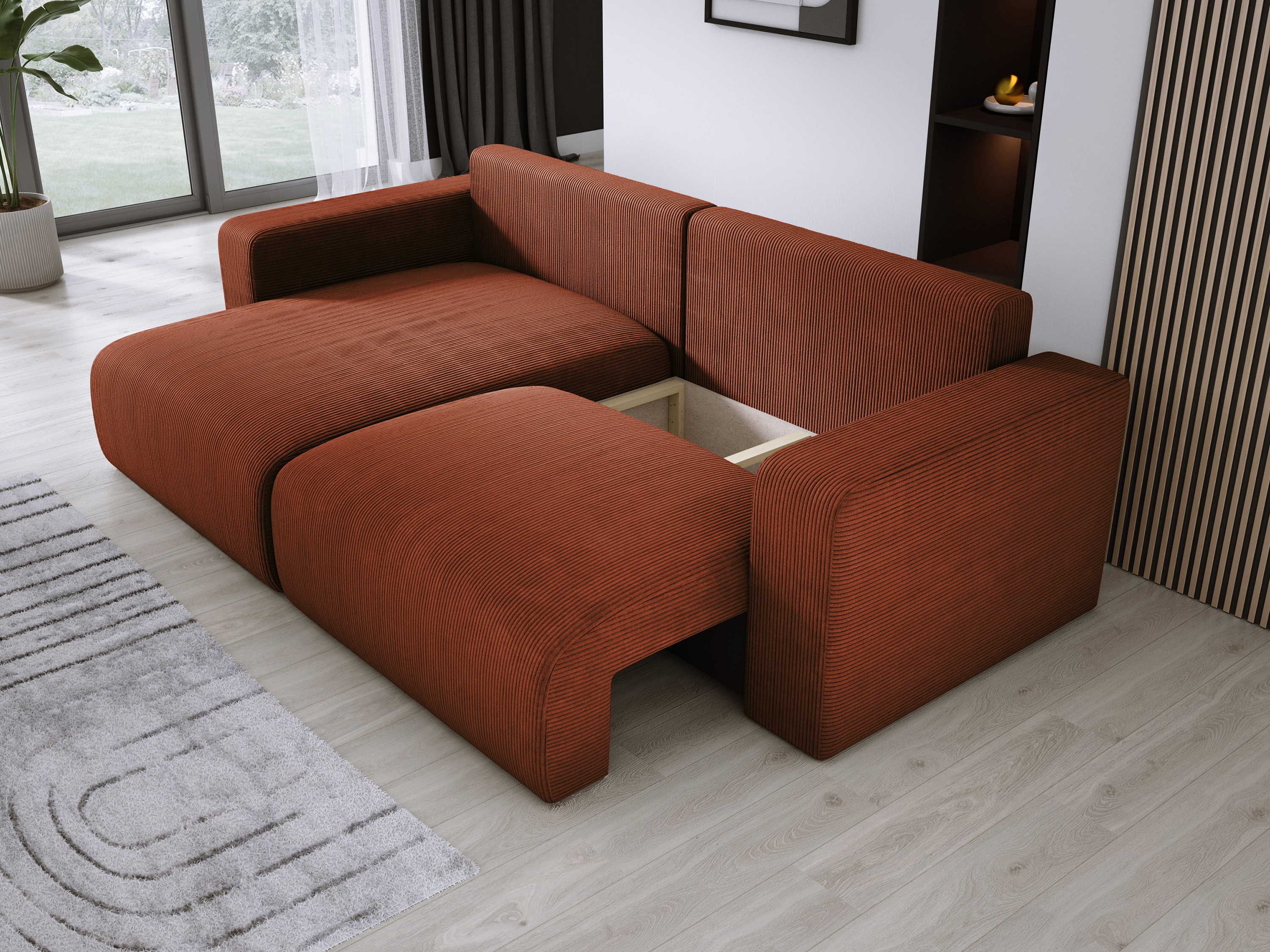 Dzięki kompaktowemu kształtowi litery L oraz możliwości uniwersalnego montażu otomany, narożnik z łatwością dopasuje się do każdego wnętrza – klasycznego, nowoczesnego czy skandynawskiego.