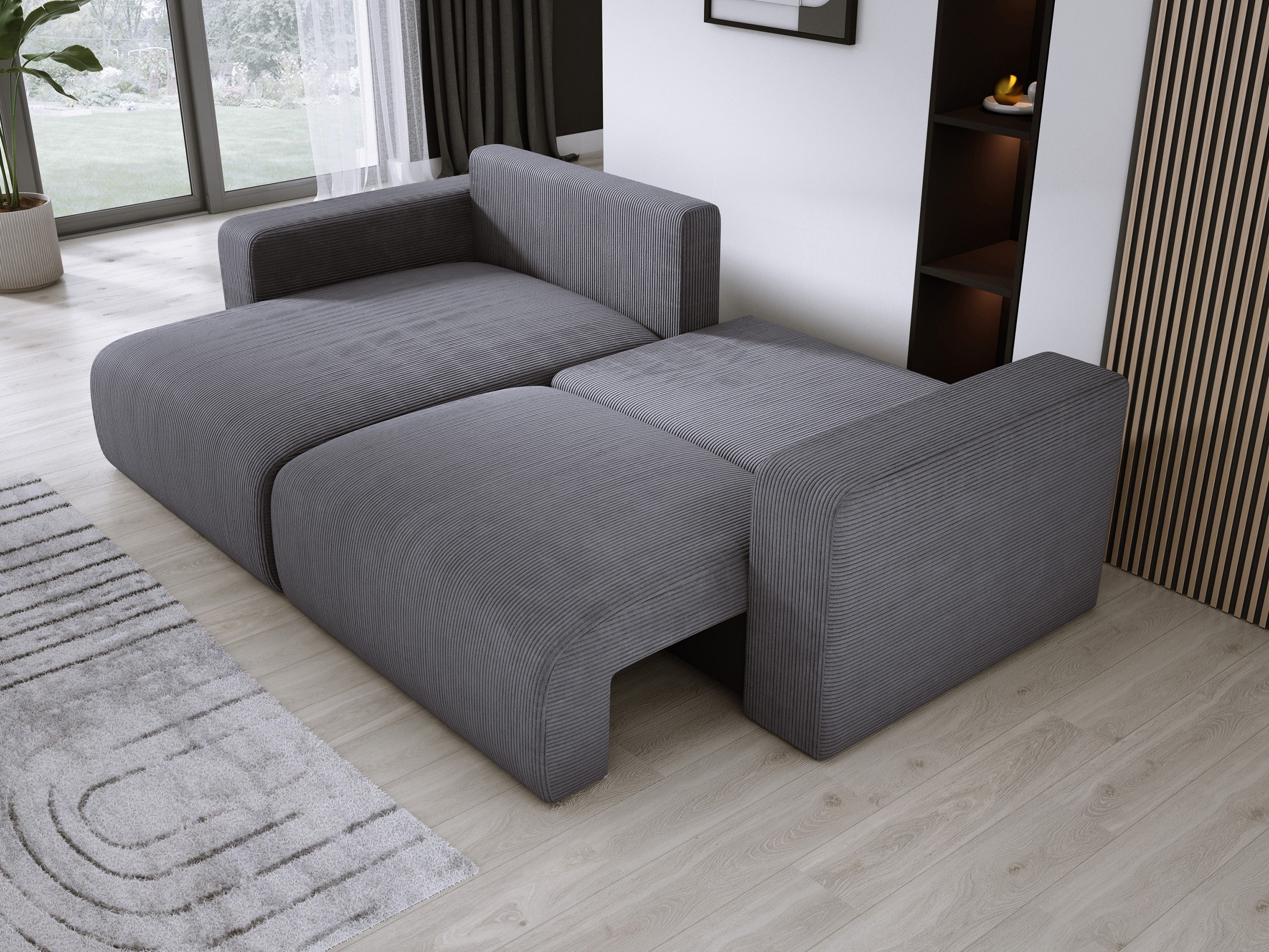 Miękkie poduchy oparciowe i wysokiej jakości obicie sztruksowe dodają mu przytulności i nowoczesnego charakteru.