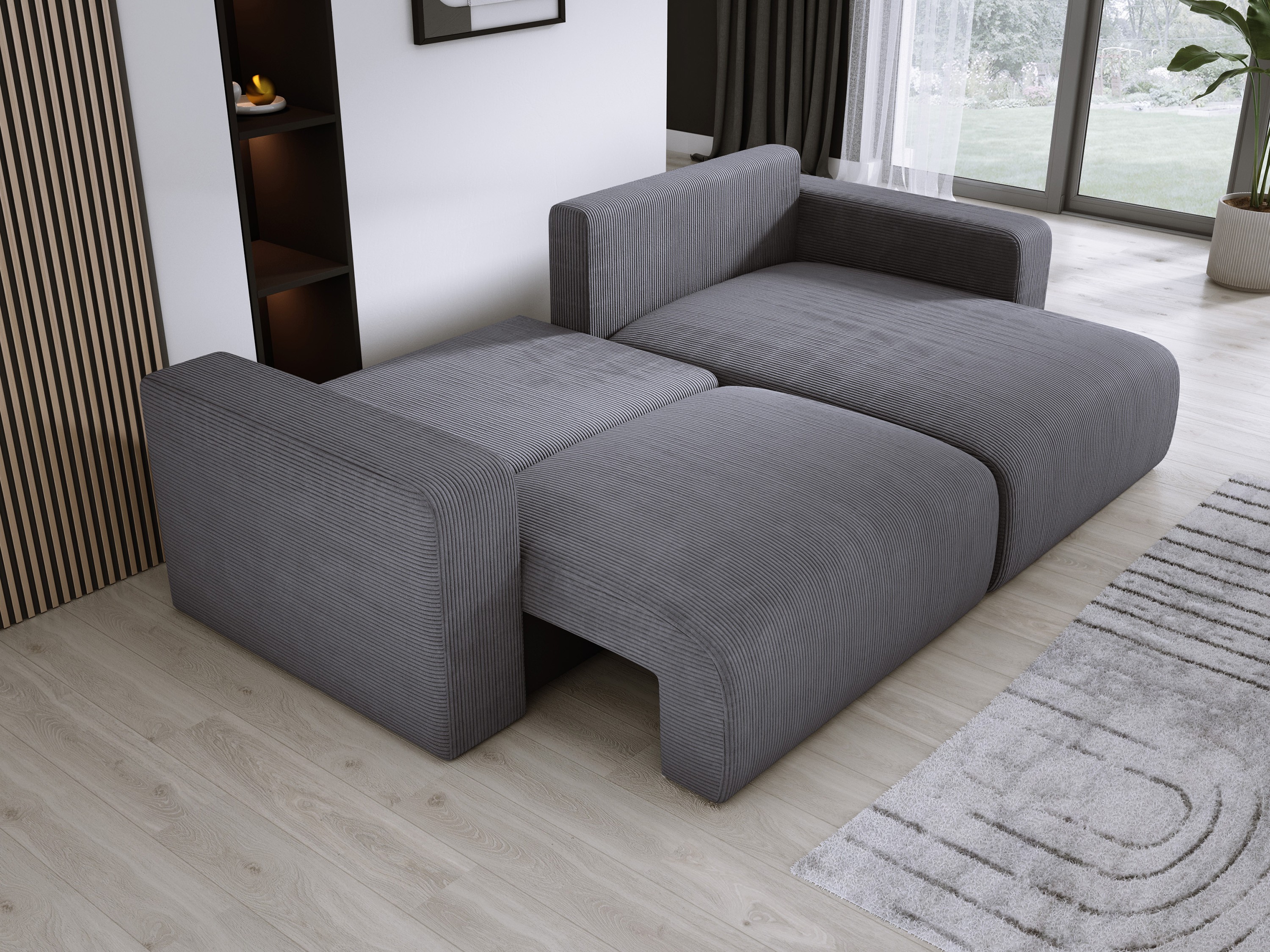 Miękkie poduchy oparciowe i wysokiej jakości obicie sztruksowe dodają mu przytulności i nowoczesnego charakteru.