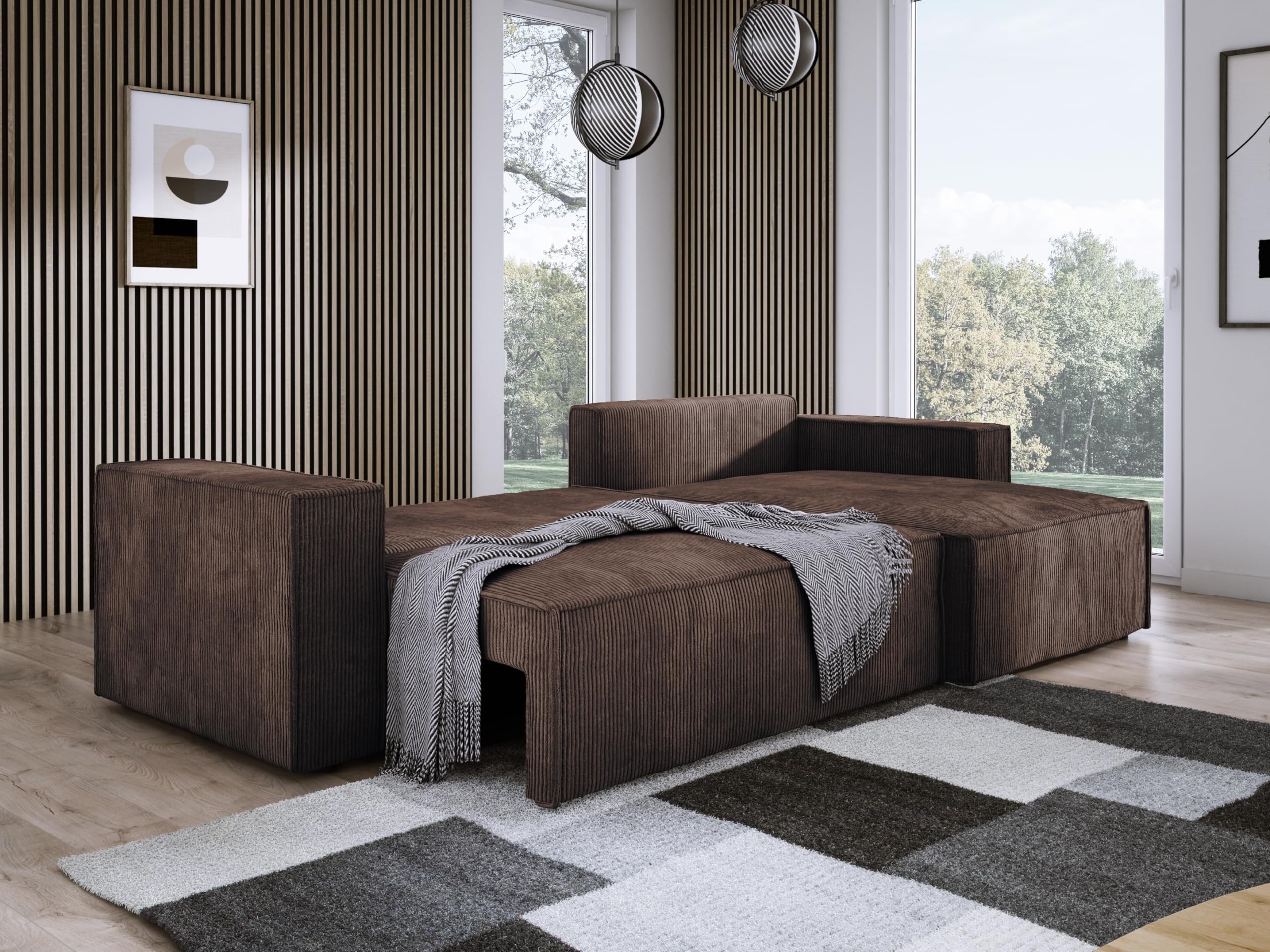 Przestronny pojemnik na pościel ułatwia przechowywanie, a miękka tkanina dodaje przytulności, czyniąc narożnik idealnym miejscem do relaksu.