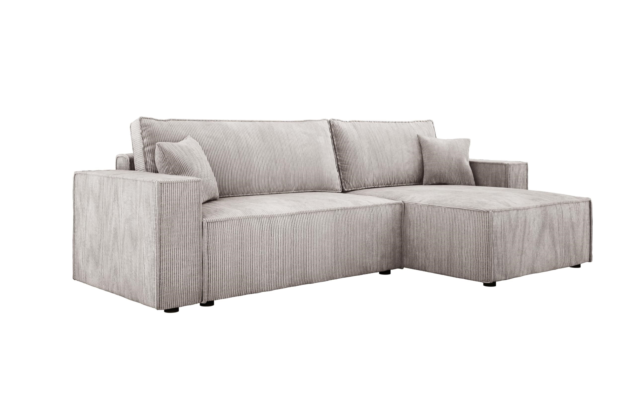 Przestronny pojemnik na pościel ułatwia przechowywanie, a miękka tkanina dodaje przytulności, czyniąc narożnik idealnym miejscem do relaksu.