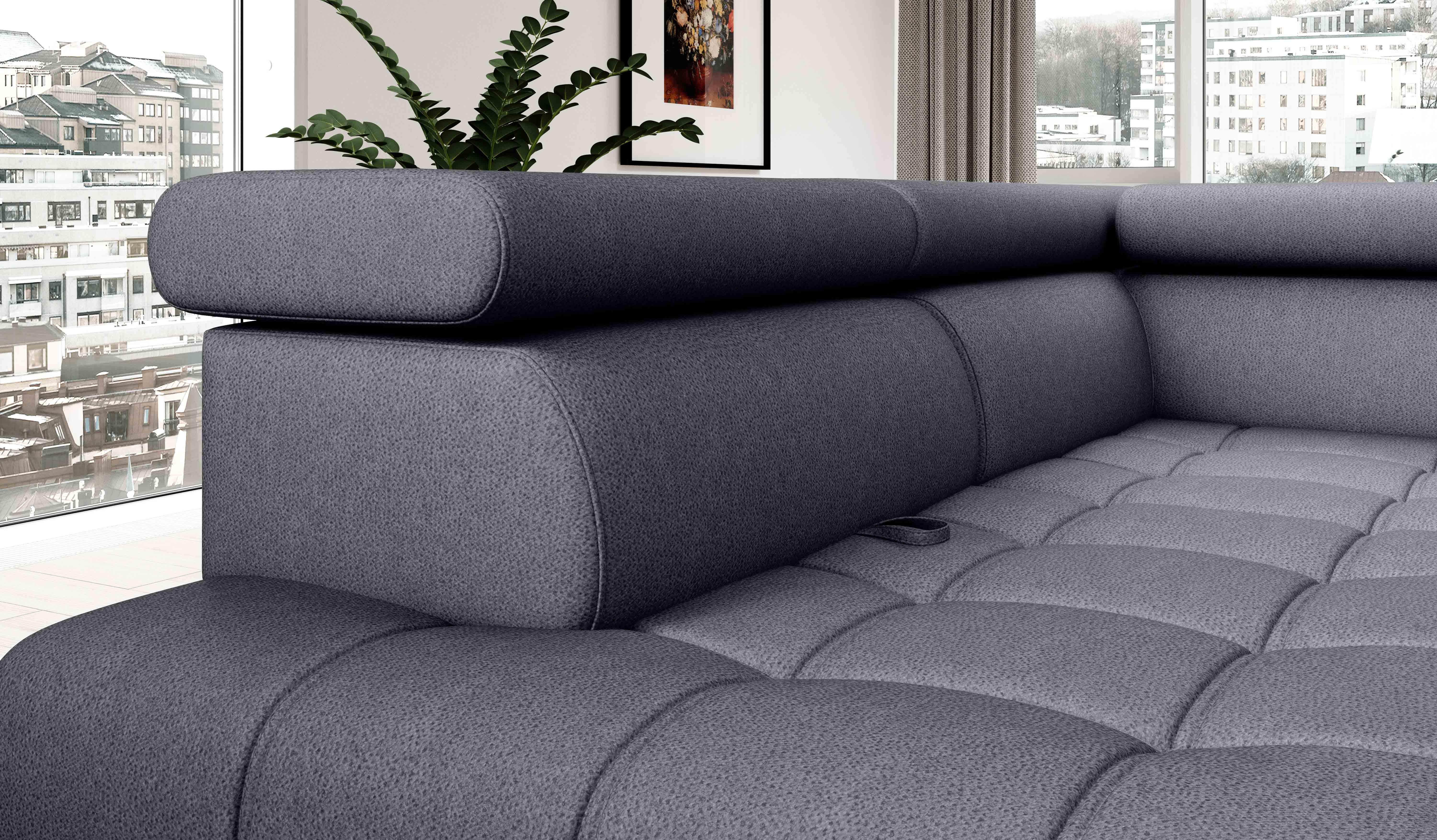 Nowoczesny design z regulowanymi zagłówkami i miękkimi poduszkami gwarantuje wygodę i styl w Twoim salonie.