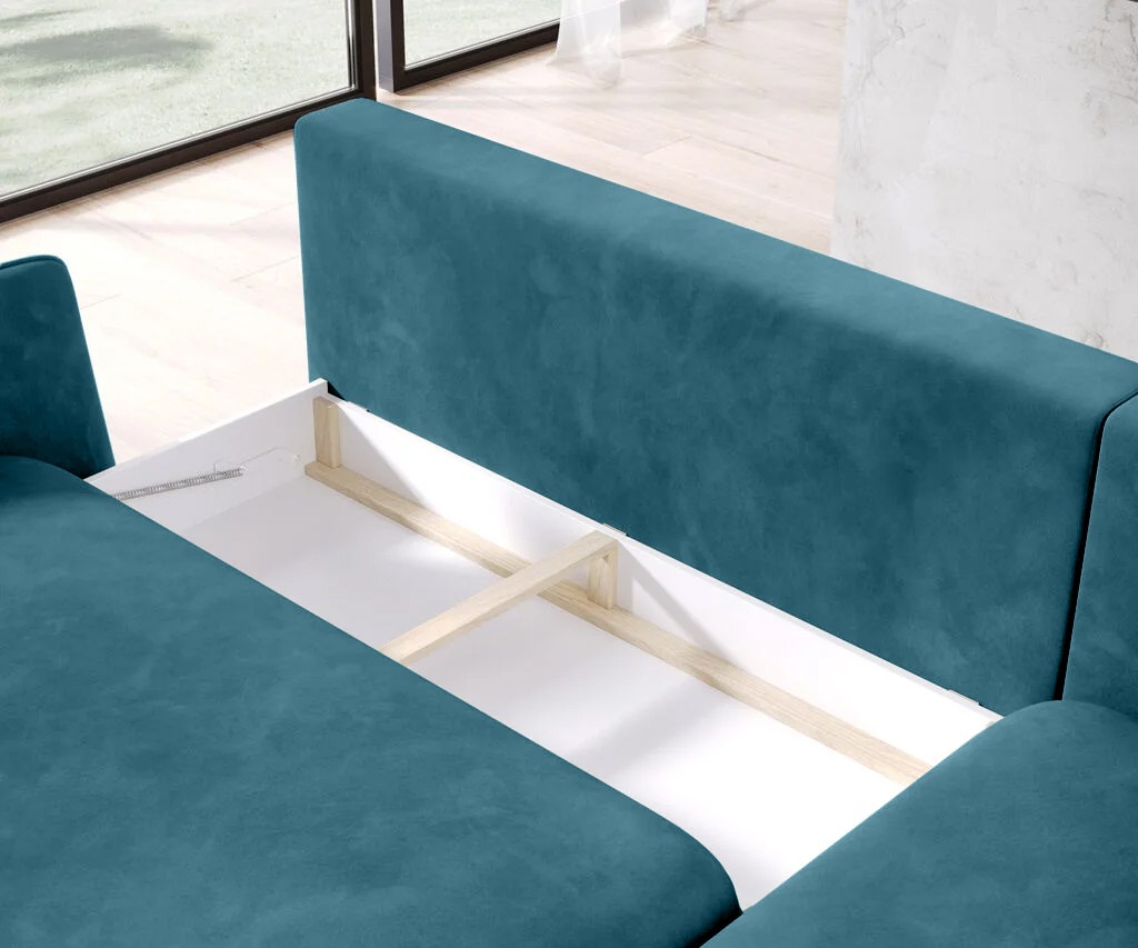 Dodatkowy pojemnik na pościel (13,5x60x127 cm) zapewnia praktyczne miejsce do przechowywania, pomagając utrzymać porządek w salonie.