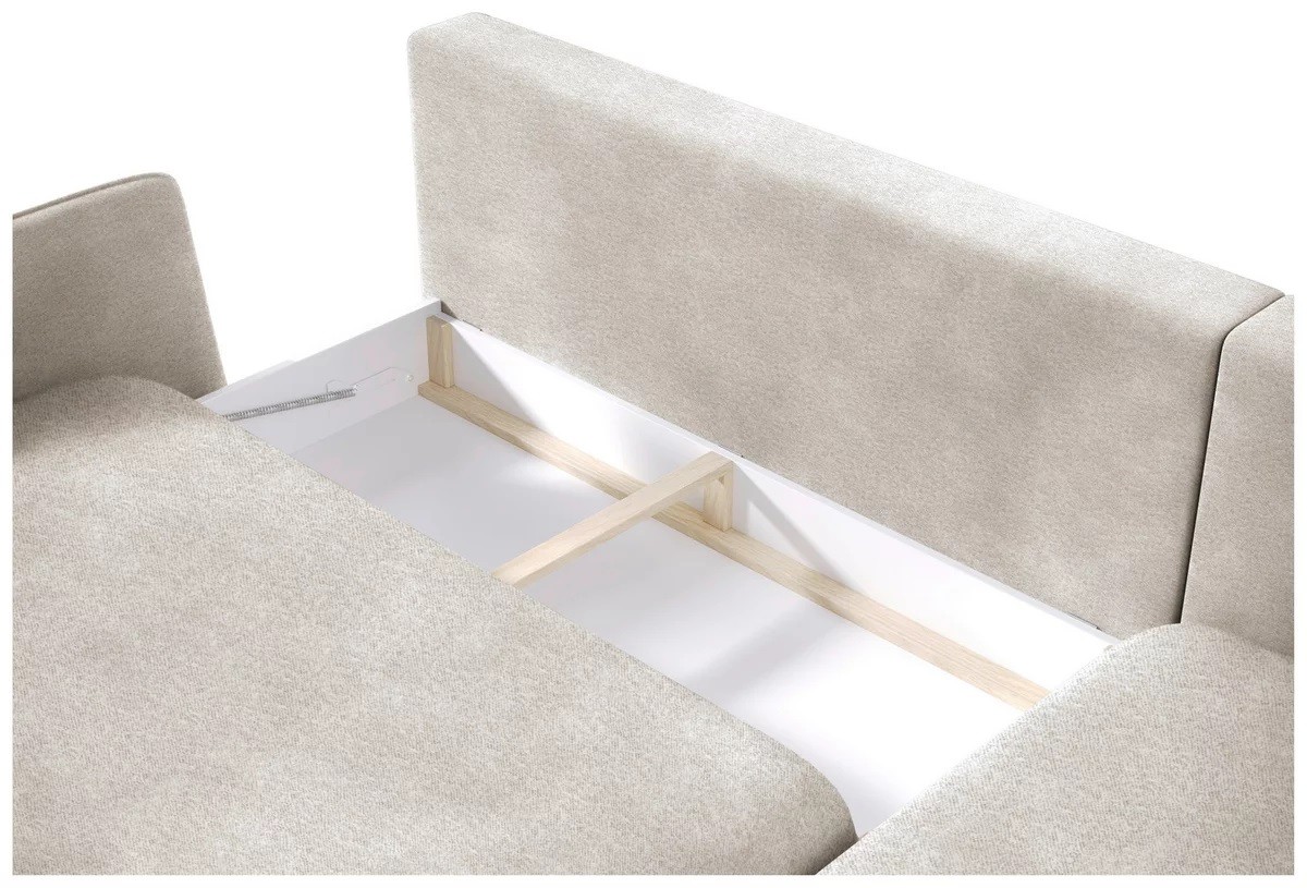 Dodatkowy pojemnik na pościel (13,5x60x127 cm) zapewnia praktyczne miejsce do przechowywania, pomagając utrzymać porządek w salonie.