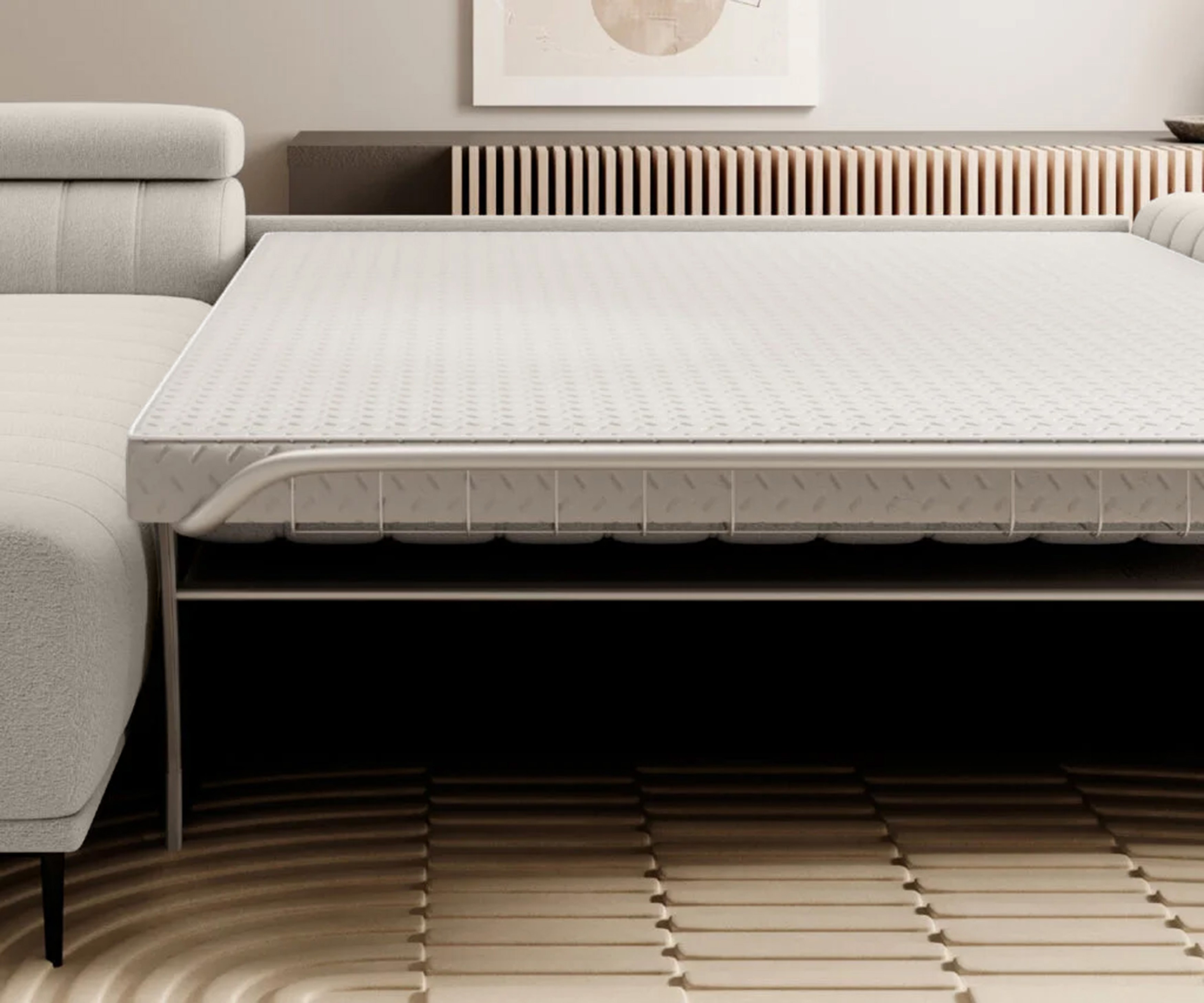 Wyposażony w funkcję spania typu system włoski, umożliwia szybkie i lekkie rozkładanie, zapewniając wygodną powierzchnię nocnego wypoczynku. Dodatkowy pojemnik na pościel oraz regulowane zagłówki zwiększają komfort codziennego użytkowania.