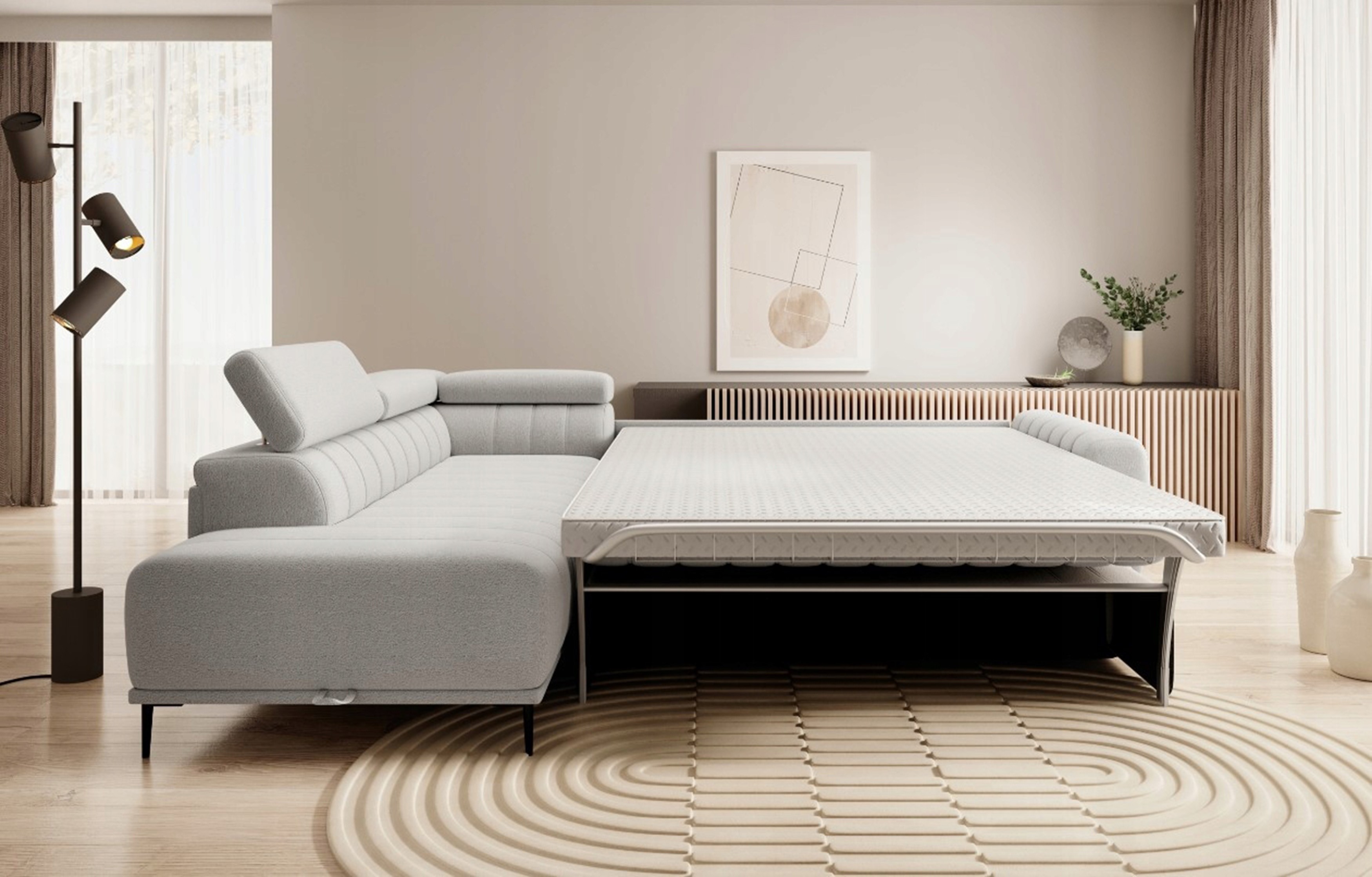 Wyposażony w funkcję spania typu system włoski, umożliwia szybkie i lekkie rozkładanie, zapewniając wygodną powierzchnię nocnego wypoczynku. Dodatkowy pojemnik na pościel oraz regulowane zagłówki zwiększają komfort codziennego użytkowania.