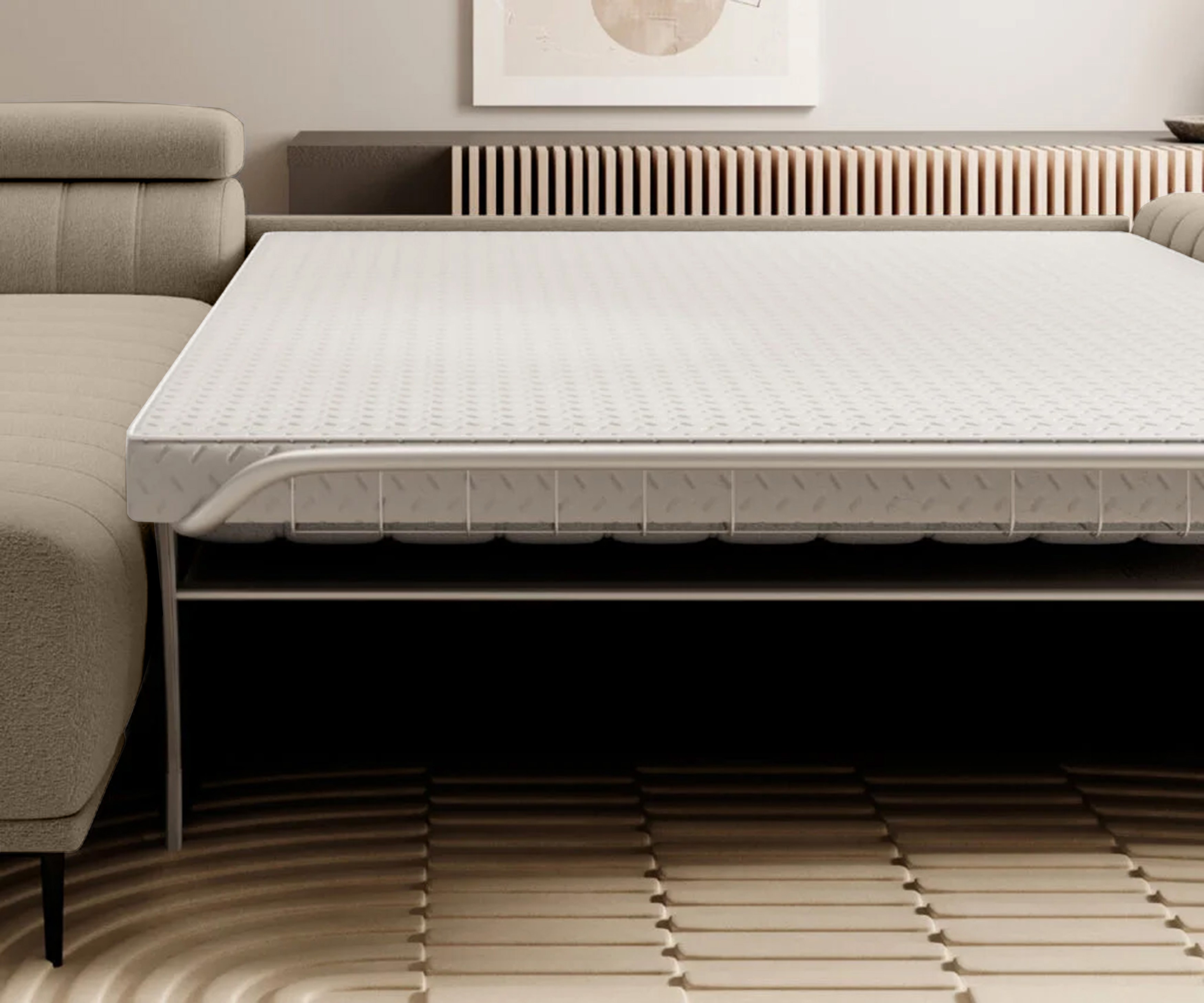 Wyposażony w funkcję spania typu system włoski, umożliwia szybkie i lekkie rozkładanie, zapewniając wygodną powierzchnię nocnego wypoczynku. Dodatkowy pojemnik na pościel oraz regulowane zagłówki zwiększają komfort codziennego użytkowania.
