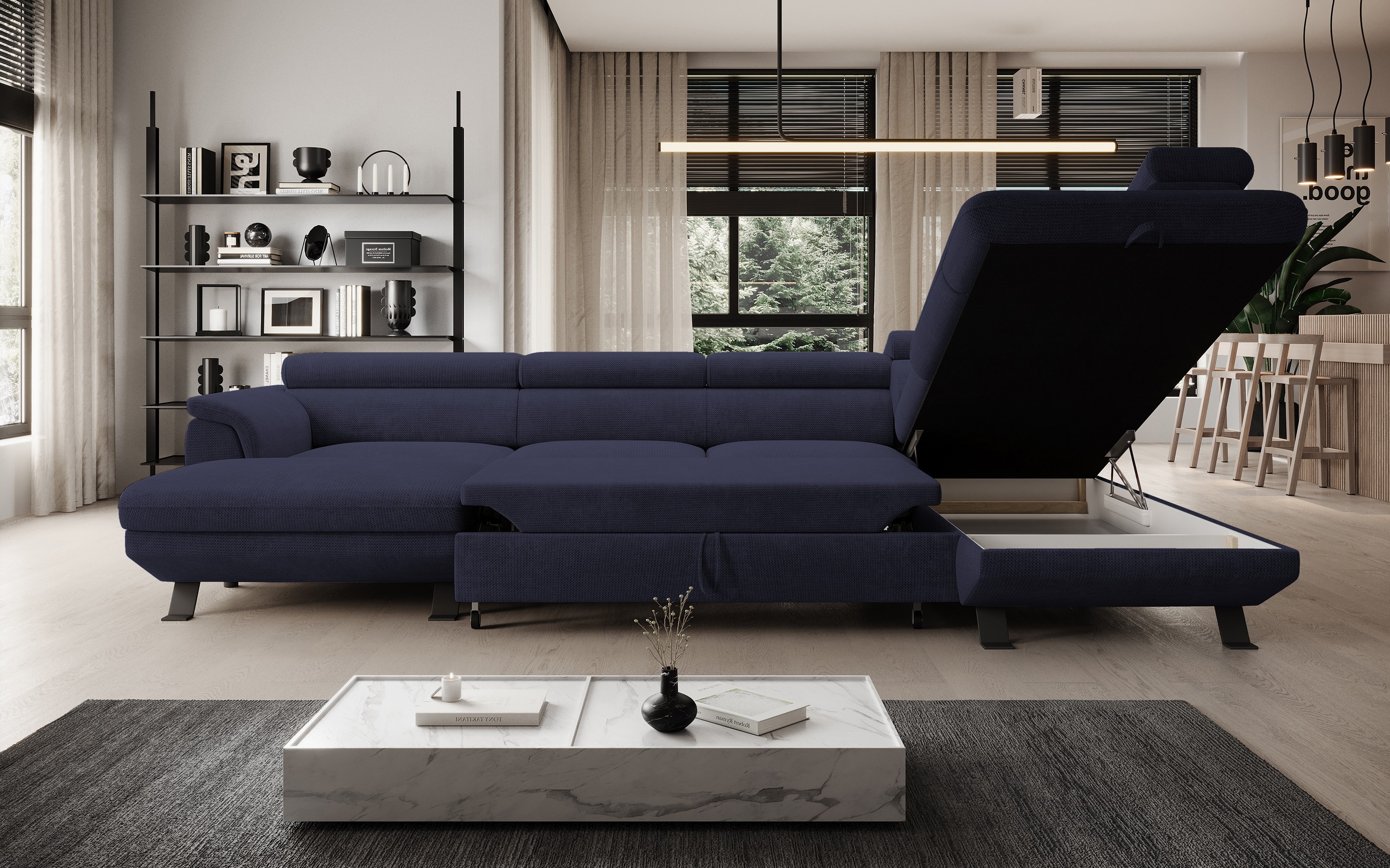 Solidny stelaż z drewna oraz płyty wiórowej zapewnia stabilność i trwałość konstrukcji, a możliwość wyboru narożnika prawego lub lewego pozwala idealnie dopasować mebel do układu wnętrza.