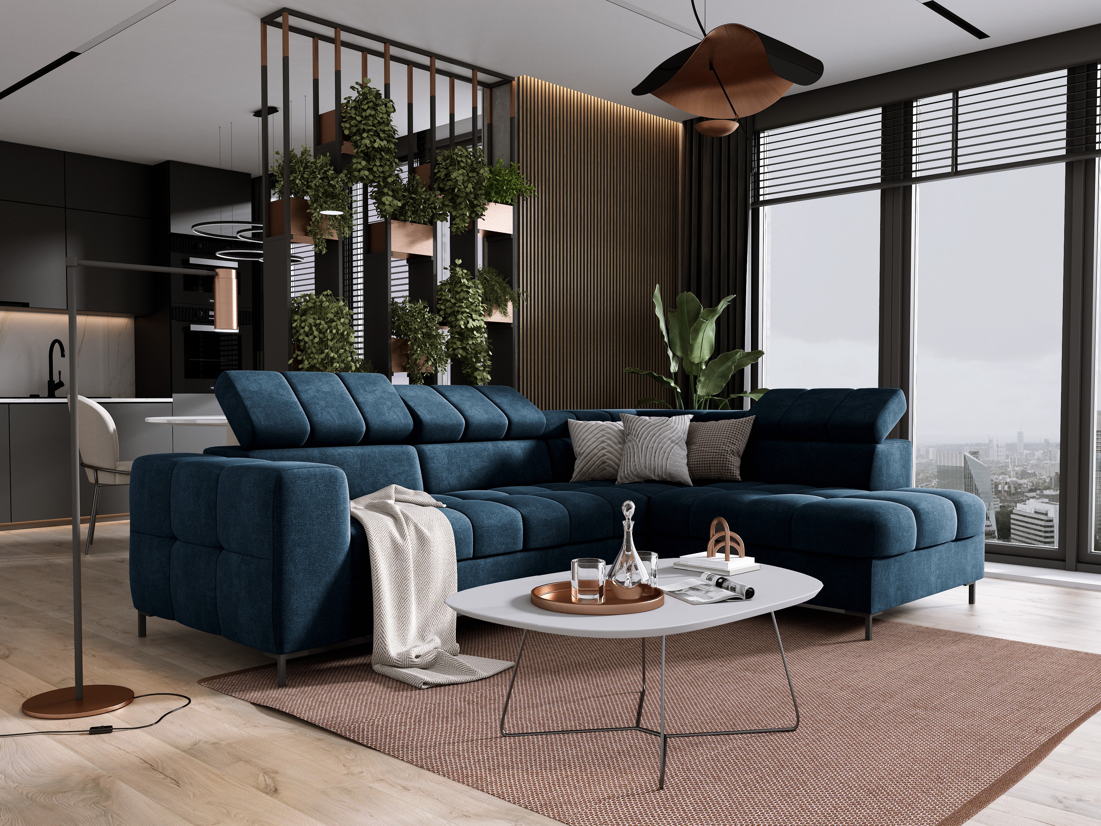 Oprócz efektownego wyglądu, mebel wyposażony jest w funkcje zwiększające komfort codziennego użytkowania – funkcję spania, regulowany zagłówek oraz pojemnik na pościel.