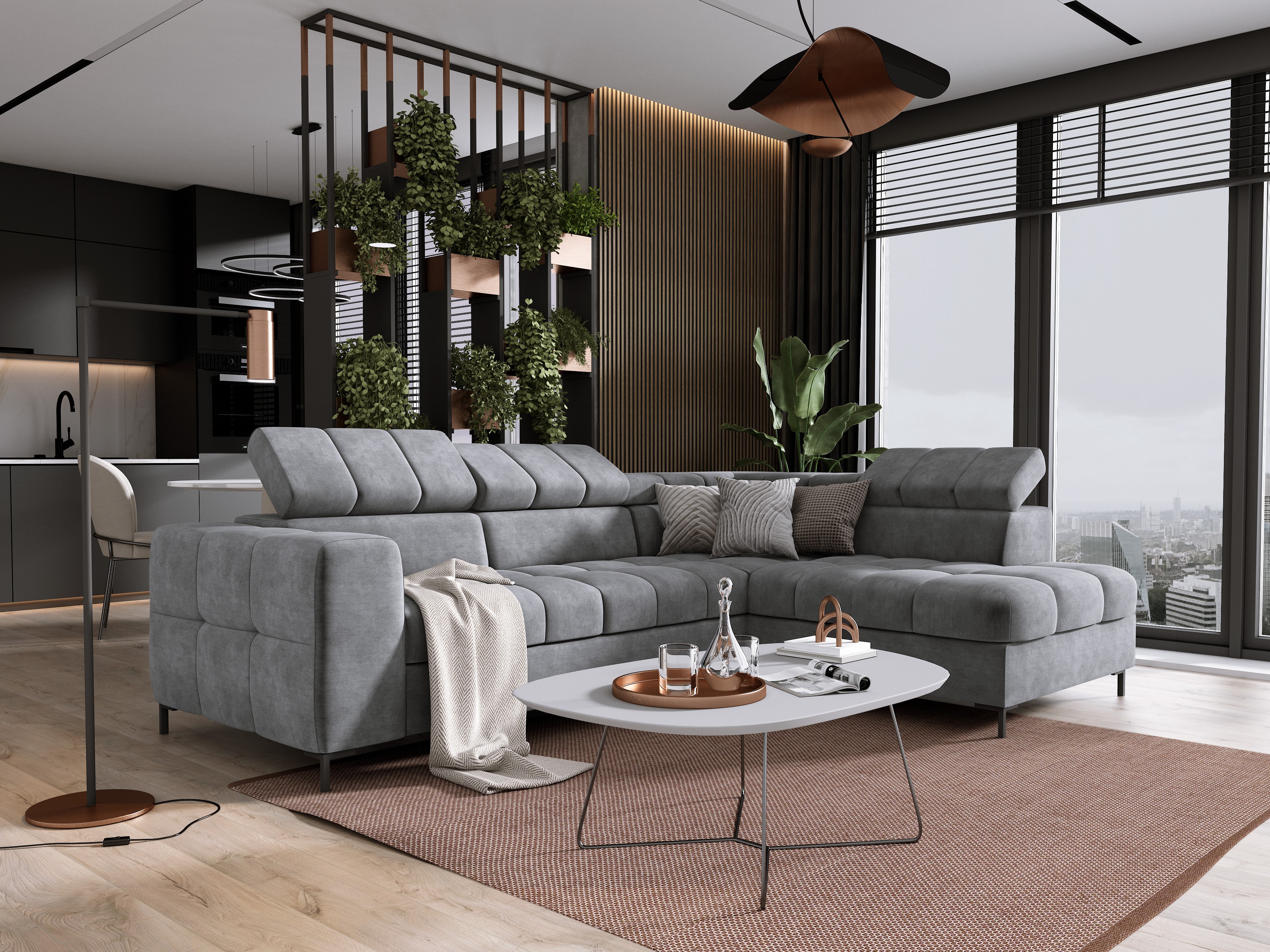Oprócz efektownego wyglądu, mebel wyposażony jest w funkcje zwiększające komfort codziennego użytkowania – funkcję spania, regulowany zagłówek oraz pojemnik na pościel.