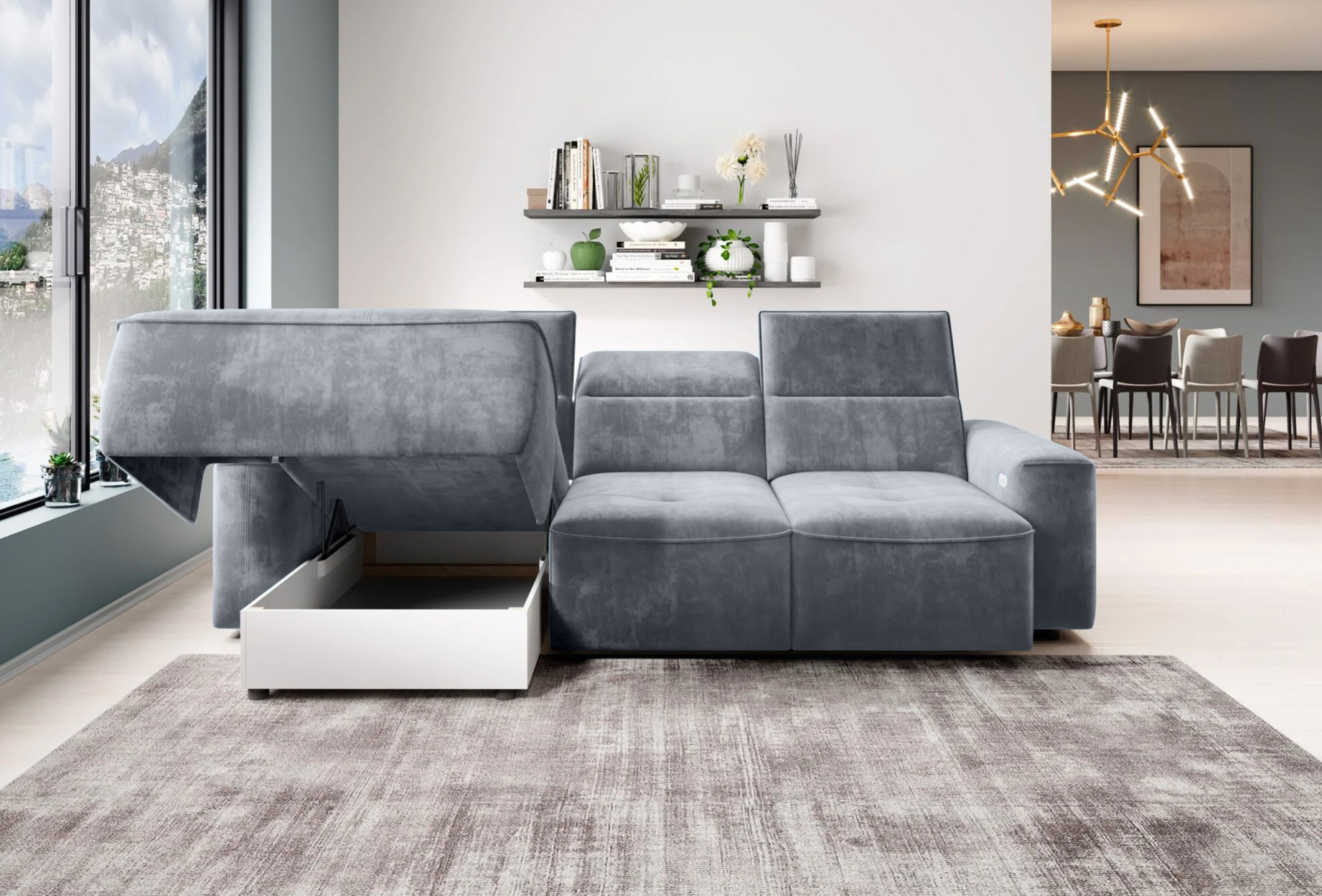 Minimalistyczna forma i subtelne pikowania nadają narożnikowi wyjątkowego stylu, a regulowane zagłówki oraz elektryczna funkcja spania zapewniają wygodę użytkowania na co dzień.
