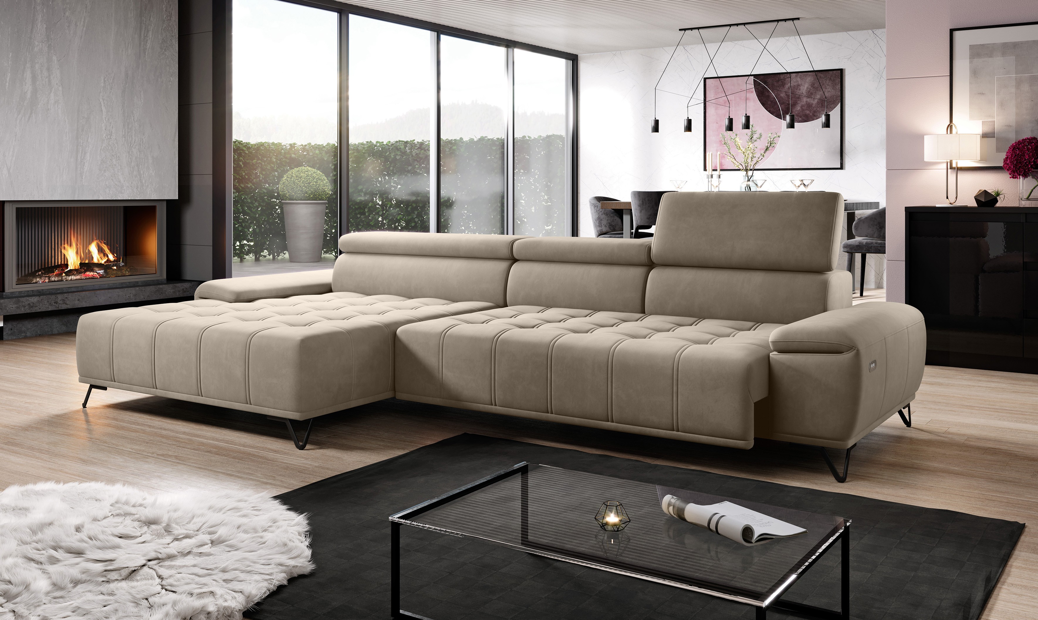 Subtelne pikowania podkreślają jego ponadczasowy charakter, a elektrycznie wysuwane siedzisko oraz regulowane zagłówki (funkcja RELAX) pozwalają na dopasowanie do indywidualnych potrzeb.