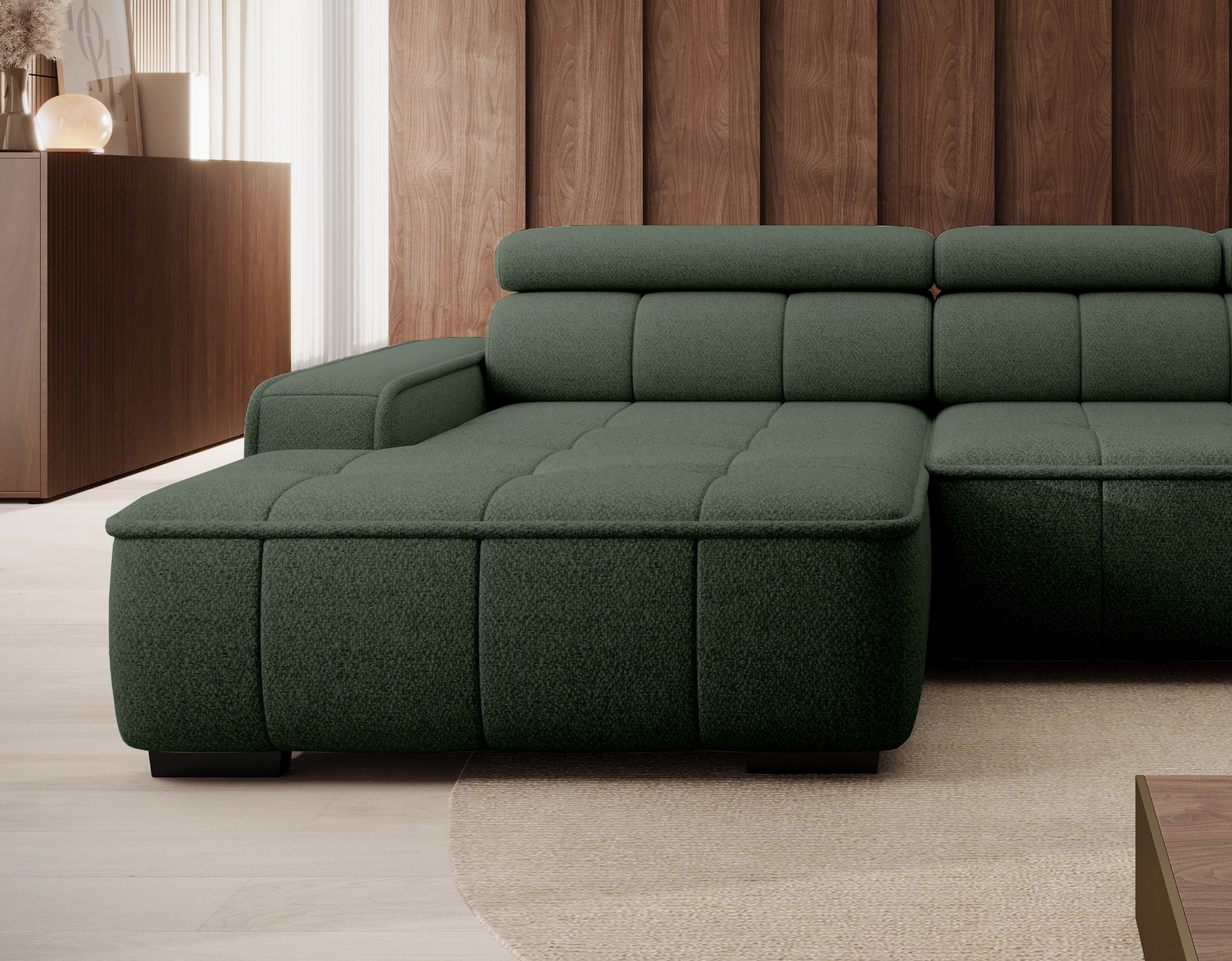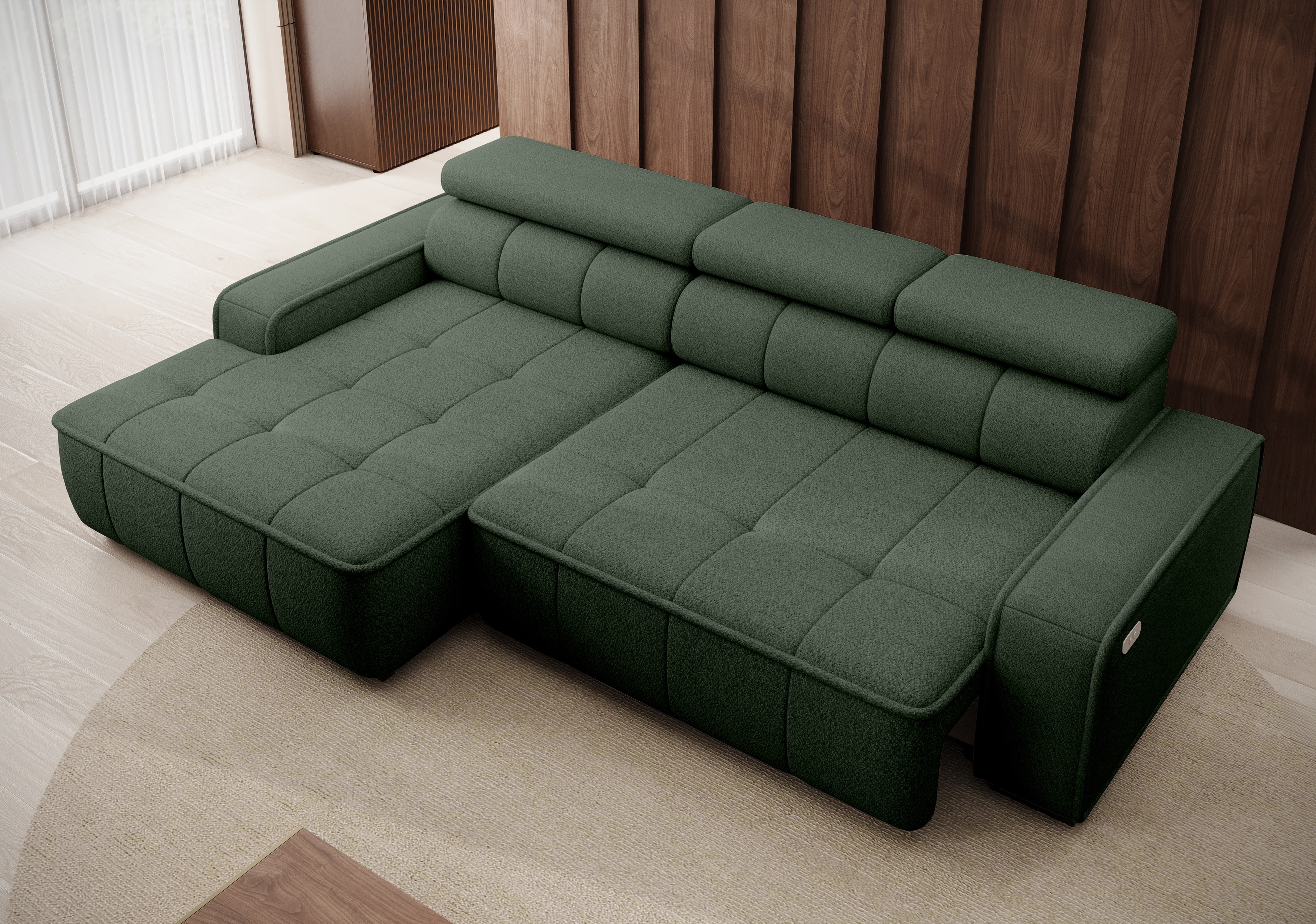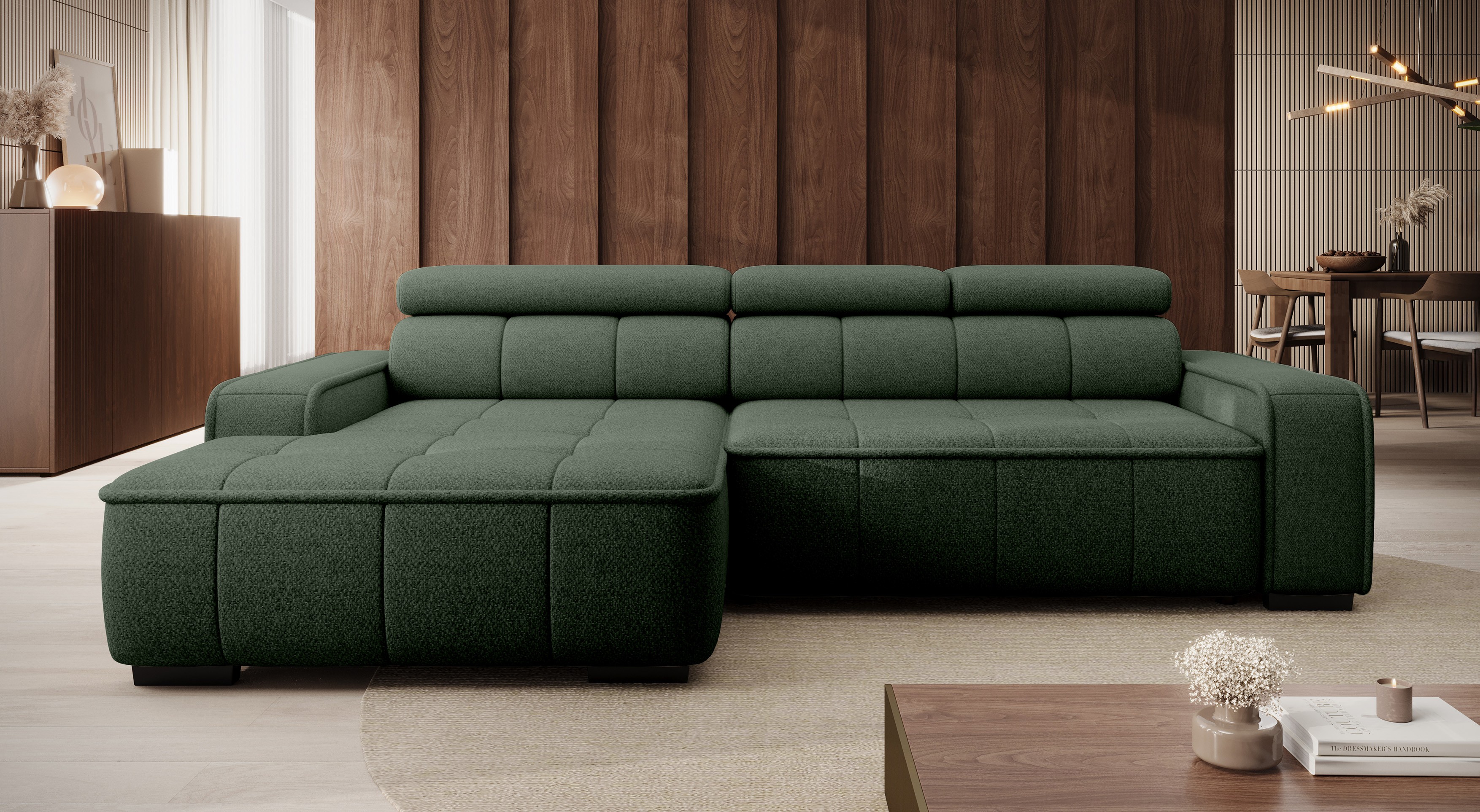 Dzięki elektrycznie regulowanej głębokości siedziska (0–27 cm) oraz regulowanym zagłówkom (funkcja RELAX), narożnik łatwo dostosujesz do swoich preferencji – zarówno podczas odpoczynku, jak i spotkań z bliskimi.