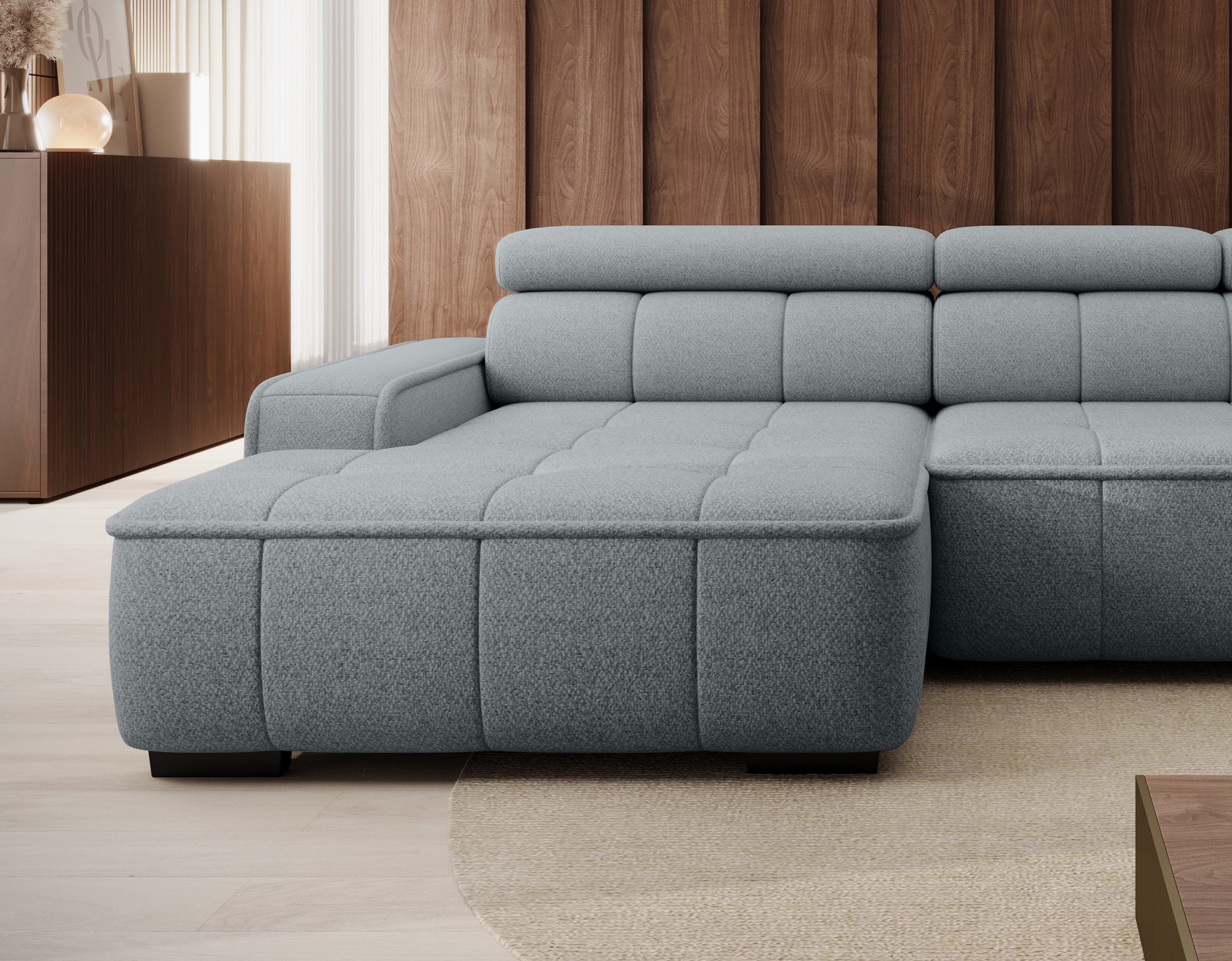 Dzięki elektrycznie regulowanej głębokości siedziska (0–27 cm) oraz regulowanym zagłówkom (funkcja RELAX), narożnik łatwo dostosujesz do swoich preferencji – zarówno podczas odpoczynku, jak i spotkań z bliskimi.