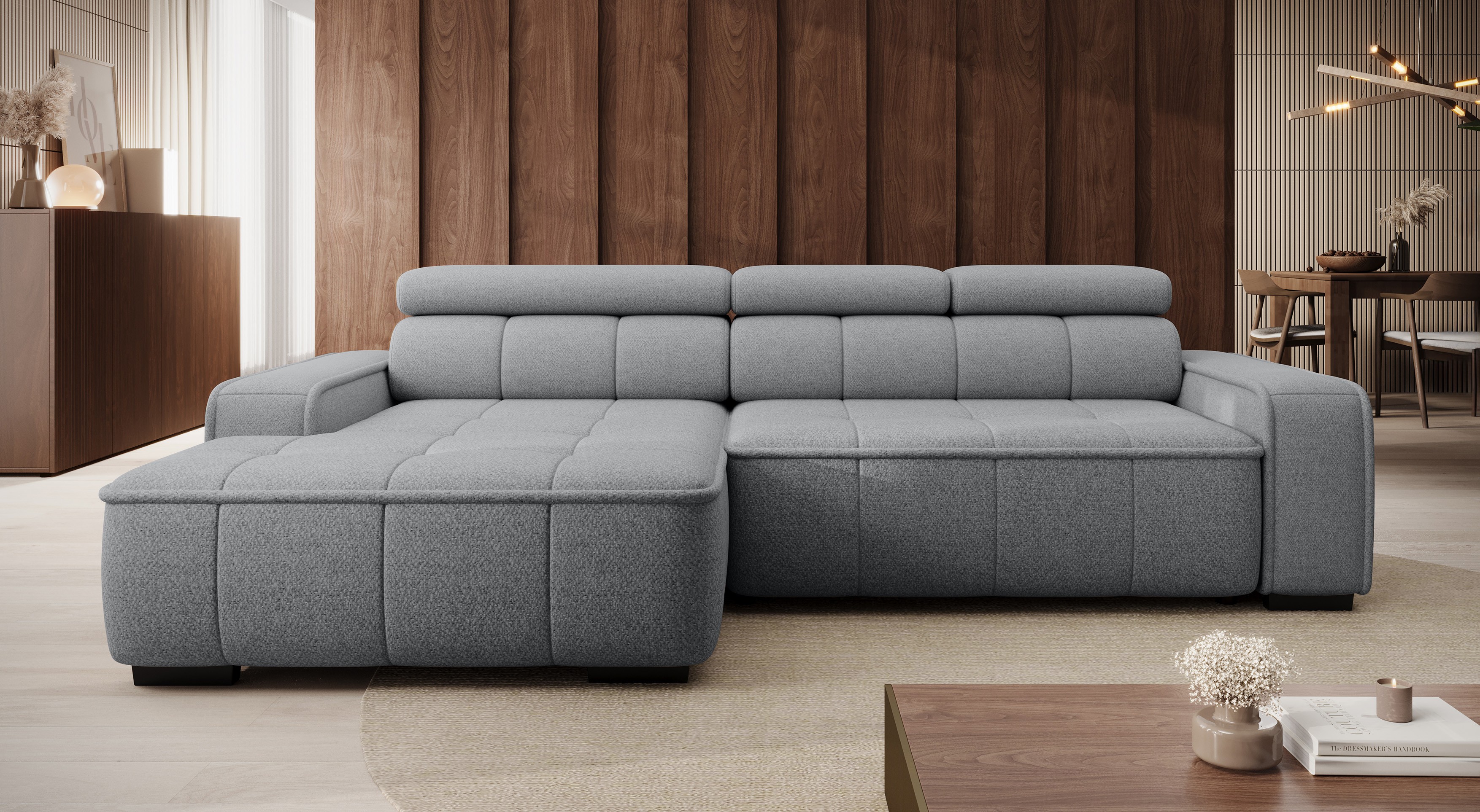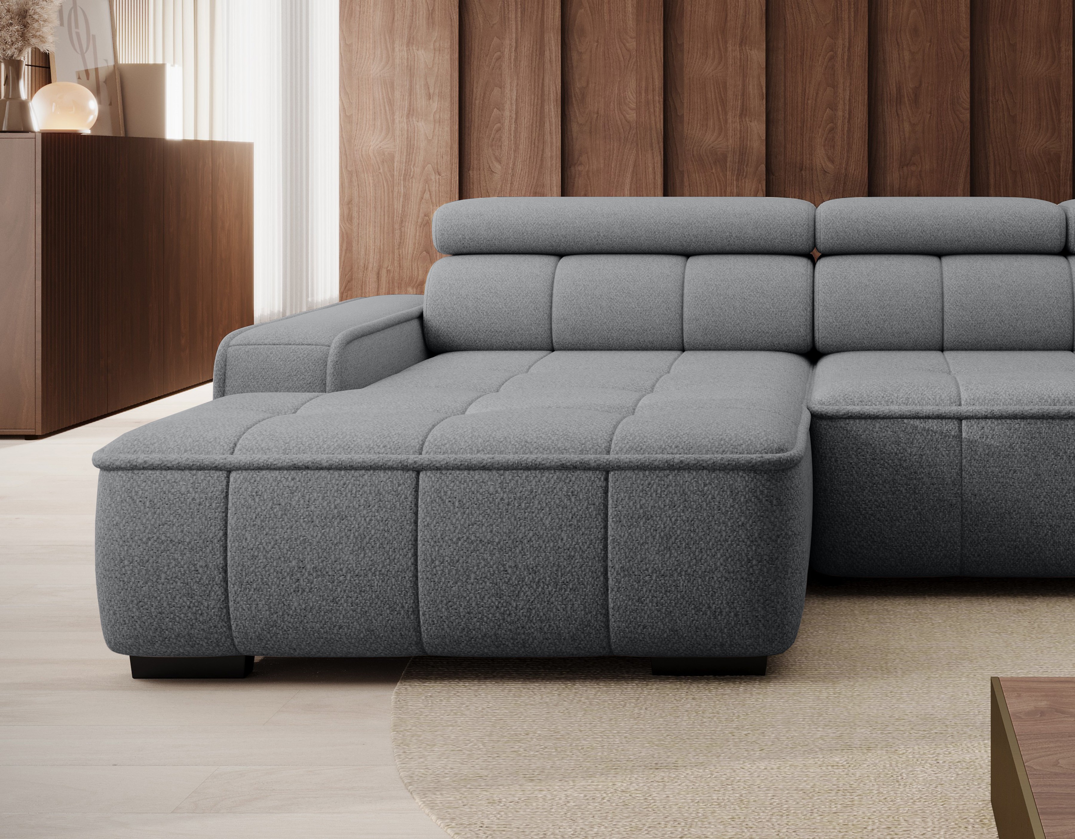 Dzięki elektrycznie regulowanej głębokości siedziska (0–27 cm) oraz regulowanym zagłówkom (funkcja RELAX), narożnik łatwo dostosujesz do swoich preferencji – zarówno podczas odpoczynku, jak i spotkań z bliskimi.