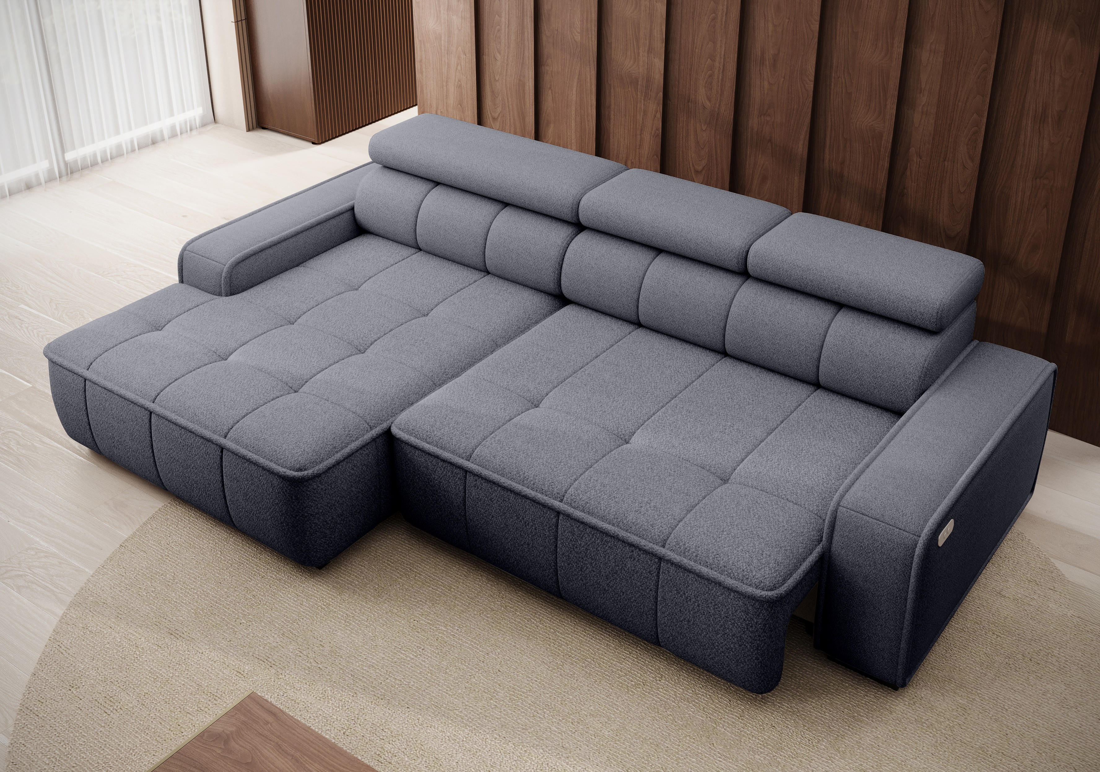 Dzięki elektrycznie regulowanej głębokości siedziska (0–27 cm) oraz regulowanym zagłówkom (funkcja RELAX), narożnik łatwo dostosujesz do swoich preferencji – zarówno podczas odpoczynku, jak i spotkań z bliskimi.