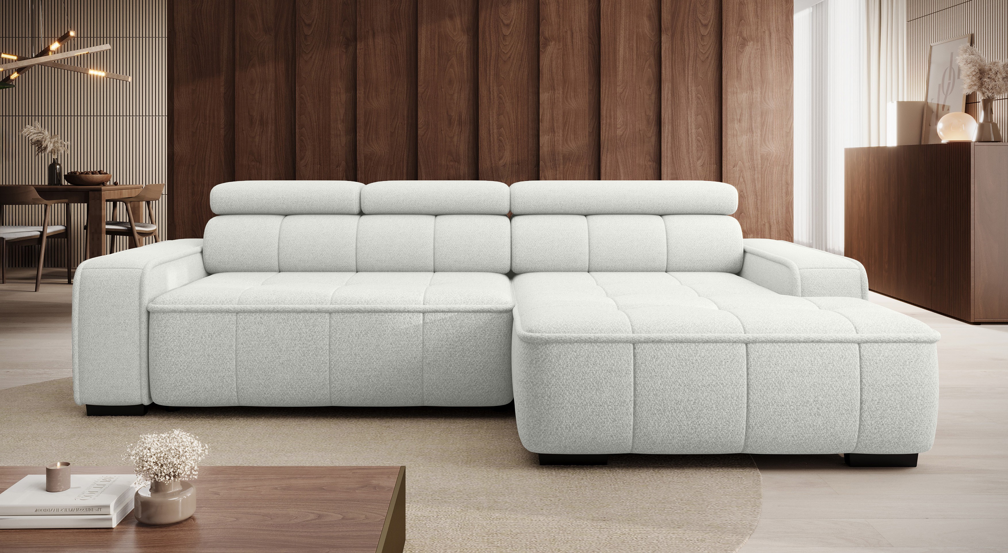 Dzięki elektrycznie regulowanej głębokości siedziska (0–27 cm) oraz regulowanym zagłówkom (funkcja RELAX), narożnik łatwo dostosujesz do swoich preferencji – zarówno podczas odpoczynku, jak i spotkań z bliskimi.