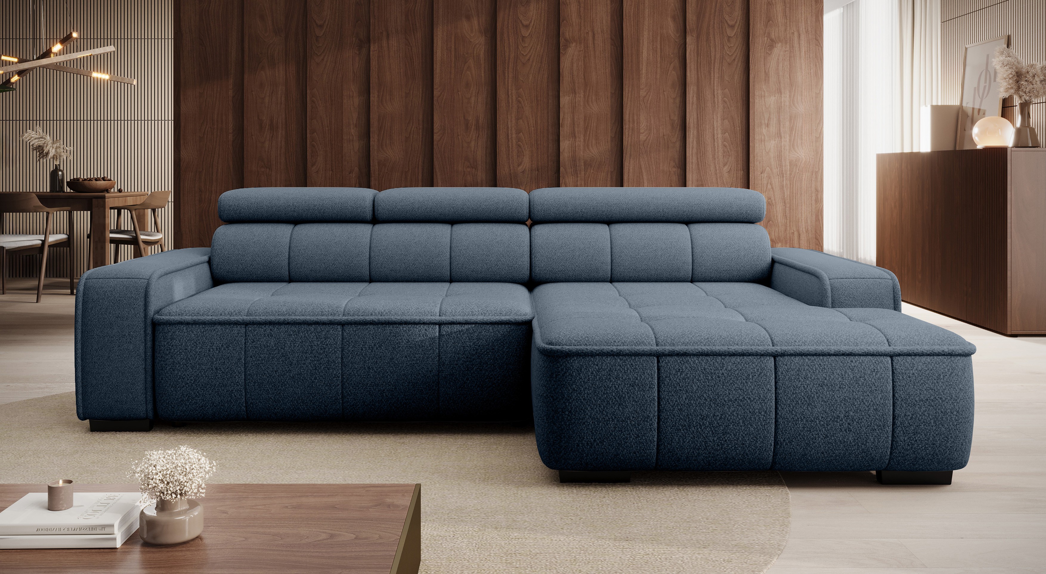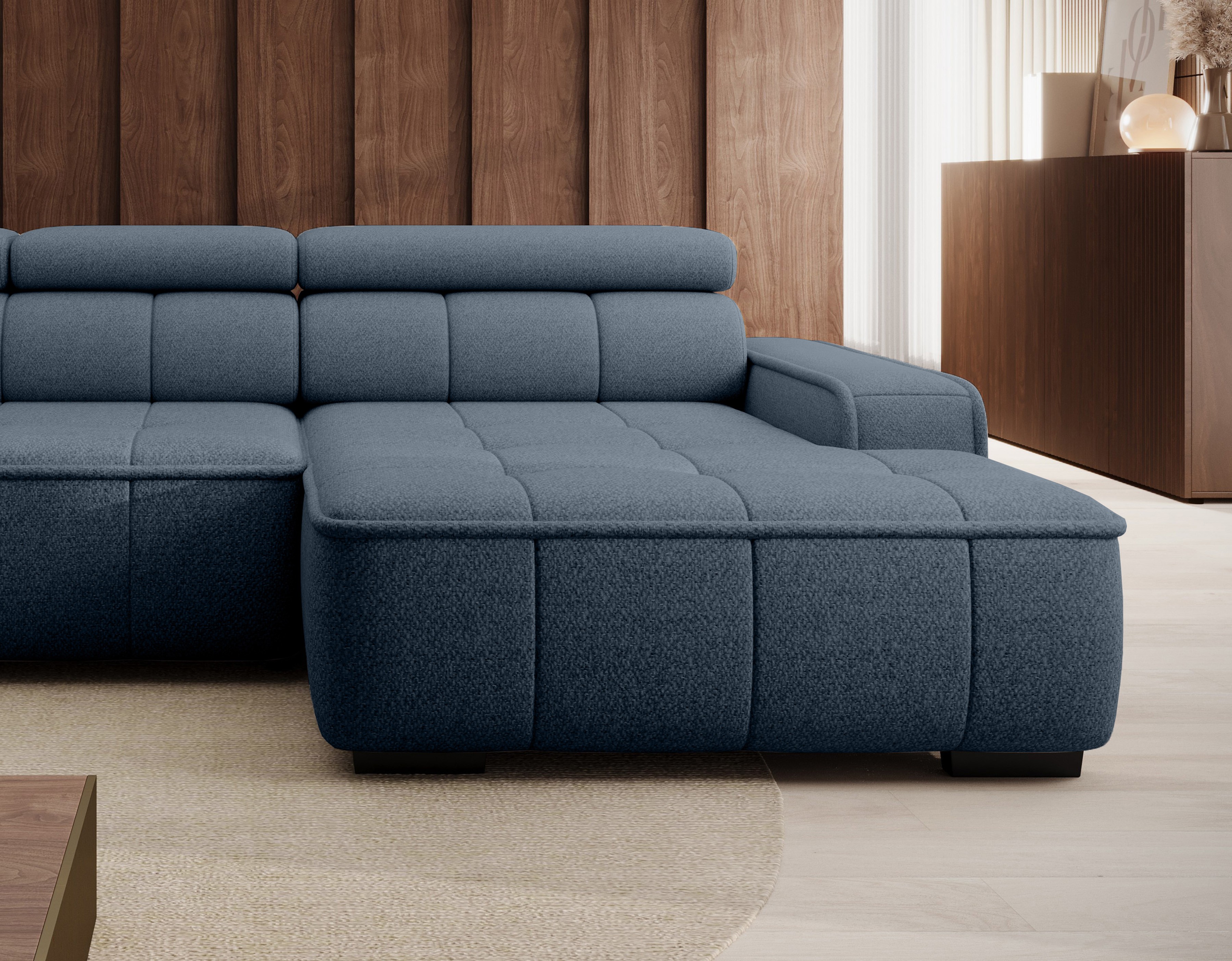 Dzięki elektrycznie regulowanej głębokości siedziska (0–27 cm) oraz regulowanym zagłówkom (funkcja RELAX), narożnik łatwo dostosujesz do swoich preferencji – zarówno podczas odpoczynku, jak i spotkań z bliskimi.