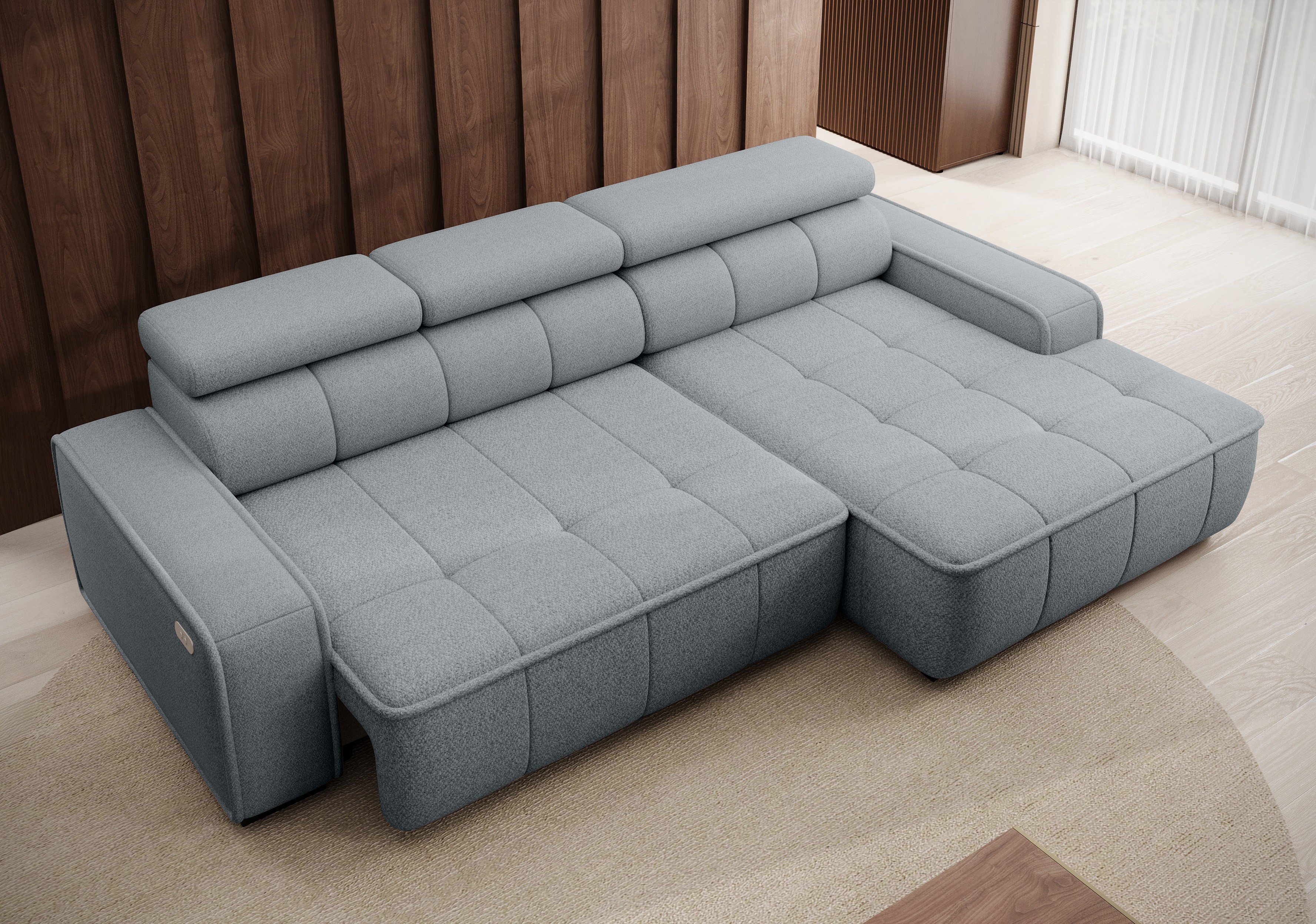 Dzięki elektrycznie regulowanej głębokości siedziska (0–27 cm) oraz regulowanym zagłówkom (funkcja RELAX), narożnik łatwo dostosujesz do swoich preferencji – zarówno podczas odpoczynku, jak i spotkań z bliskimi.