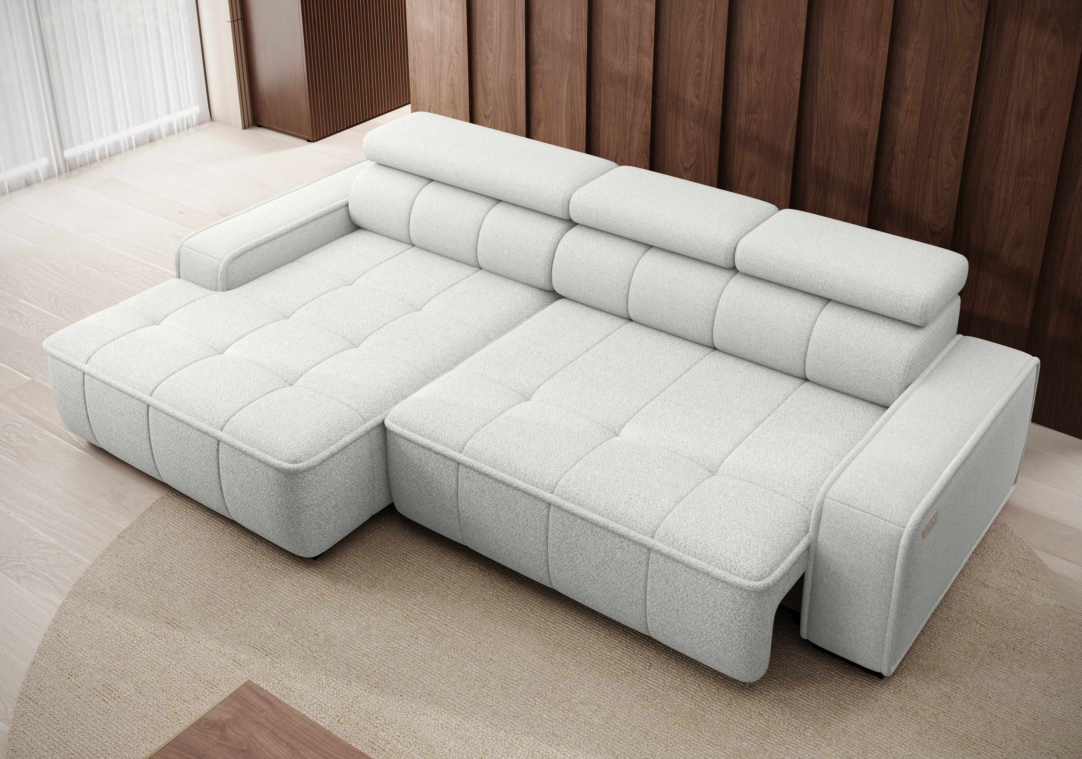 Dzięki elektrycznie regulowanej głębokości siedziska (0–27 cm) oraz regulowanym zagłówkom (funkcja RELAX), narożnik łatwo dostosujesz do swoich preferencji – zarówno podczas odpoczynku, jak i spotkań z bliskimi.