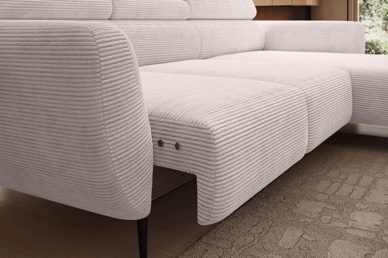 Gładkie siedzisko nadaje narożnikowi nowoczesnego charakteru, a wysokie metalowe nóżki w stylu loftowym dodają mu lekkości i elegancji.