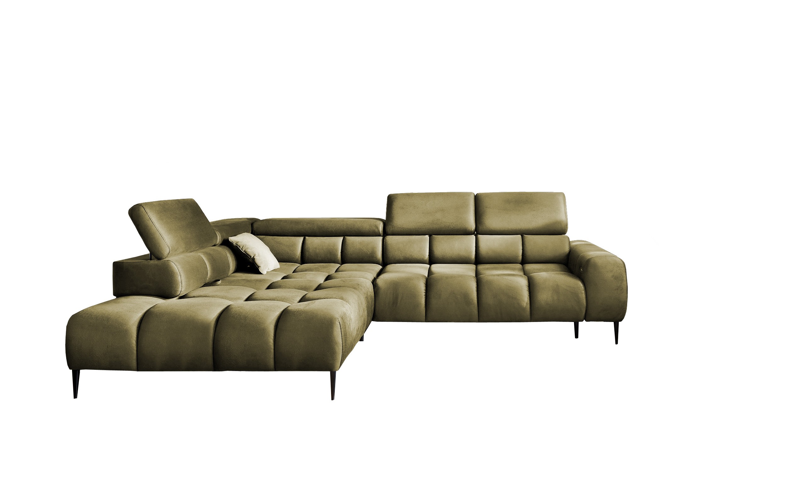 Stylowe pikowane siedzisko i wysokie metalowe nóżki (dostępne w kolorze czarnym lub złotym) nadają narożnikowi lekko loftowy, a jednocześnie nowoczesny charakter.