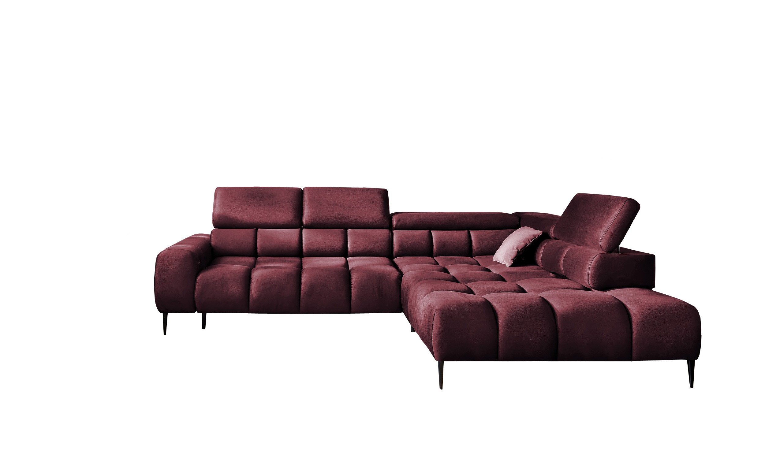 Stylowe pikowane siedzisko i wysokie metalowe nóżki (dostępne w kolorze czarnym lub złotym) nadają narożnikowi lekko loftowy, a jednocześnie nowoczesny charakter.