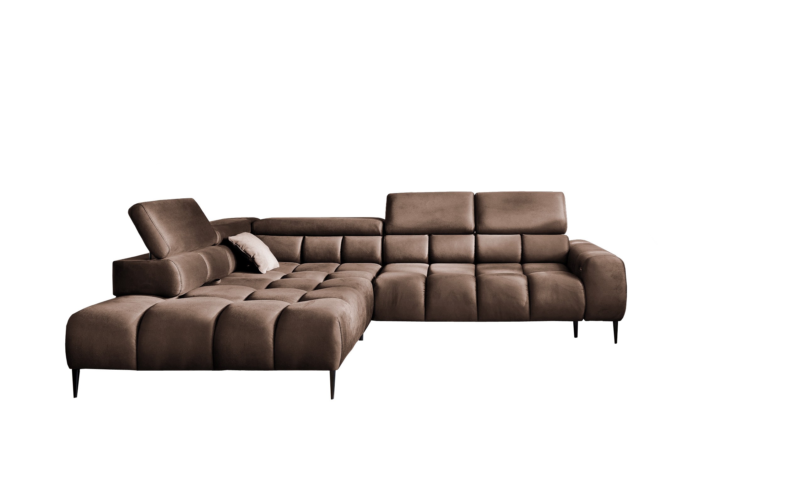 Stylowe pikowane siedzisko i wysokie metalowe nóżki (dostępne w kolorze czarnym lub złotym) nadają narożnikowi lekko loftowy, a jednocześnie nowoczesny charakter.