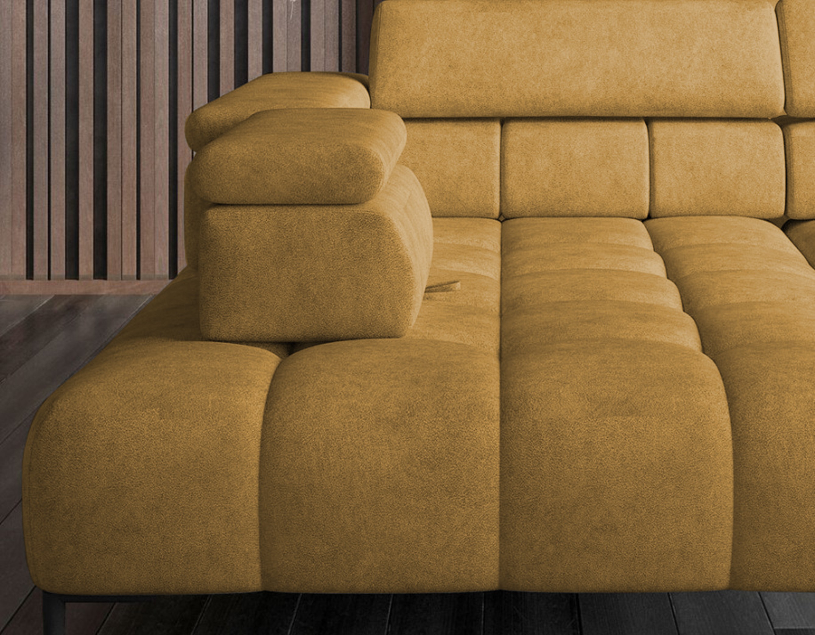 Dodatkowo narożnik wyposażony jest w przesuwne oparcie oraz regulowane zagłówki (5 sztuk), które można zablokować w wybranej pozycji, zapewniając jeszcze większy komfort.