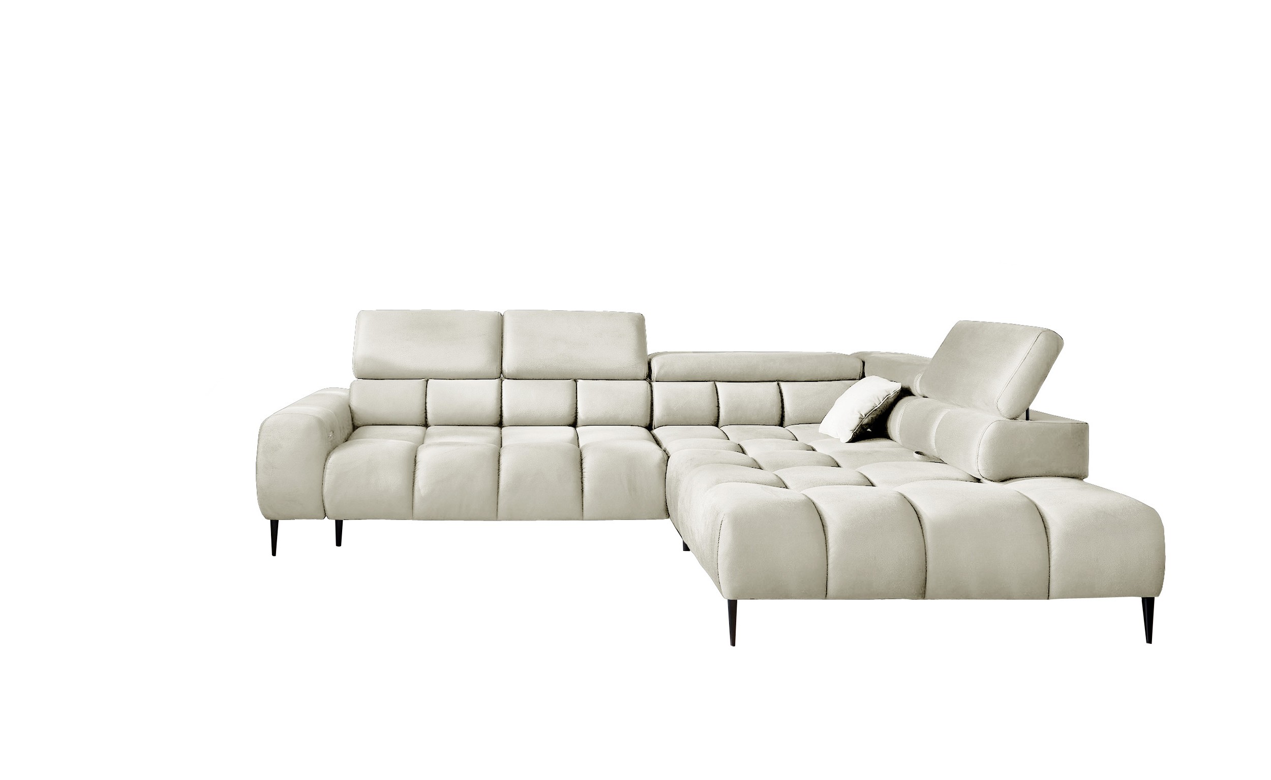 Stylowe pikowane siedzisko i wysokie metalowe nóżki (dostępne w kolorze czarnym lub złotym) nadają narożnikowi lekko loftowy, a jednocześnie nowoczesny charakter.