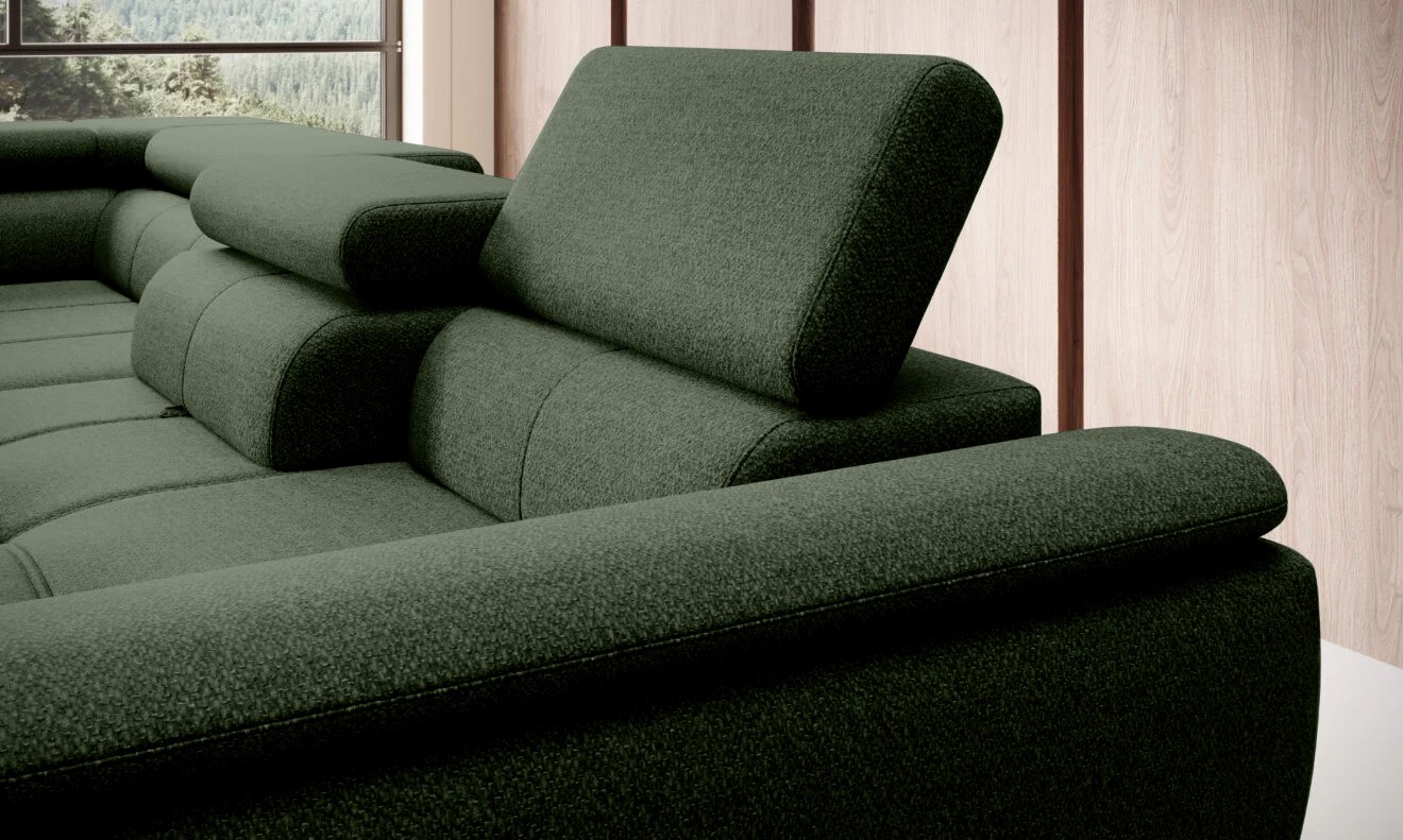Dodatkowo narożnik wyposażony jest w przesuwne oparcie oraz regulowane zagłówki, które można zablokować w wybranej pozycji, zapewniając jeszcze większy komfort.