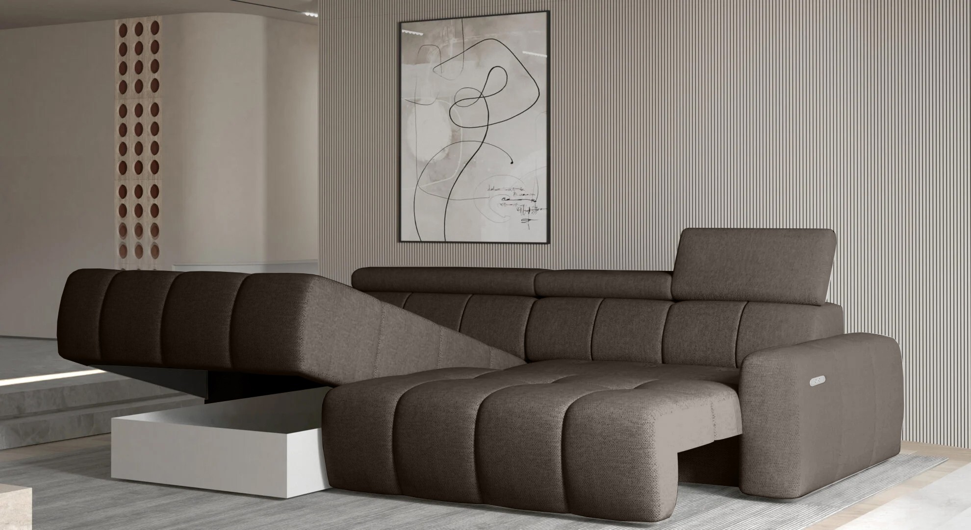 Wyposażony w elektrycznie rozkładaną funkcję spania, narożnik ENZO S umożliwia wygodny odpoczynek zarówno w ciągu dnia, jak i w nocy.