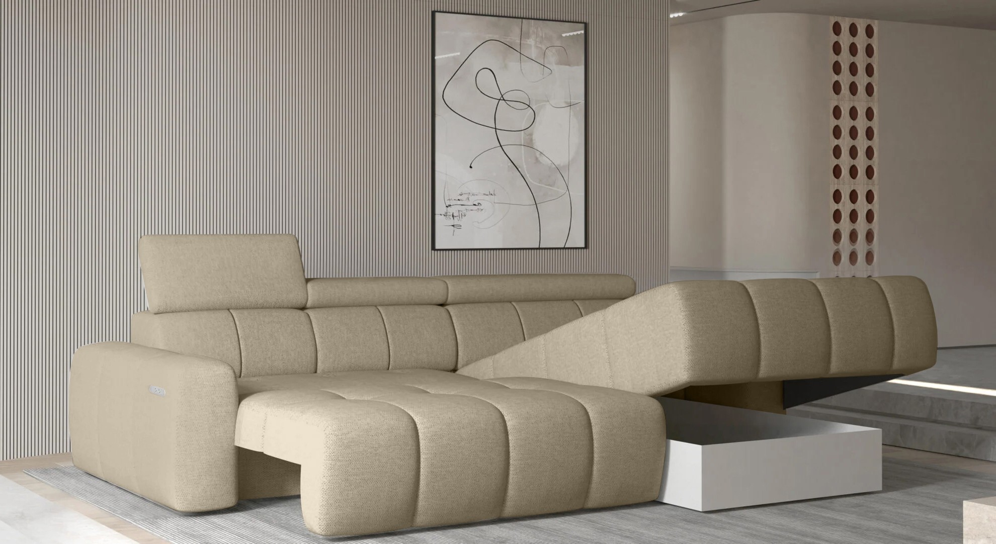 Wyposażony w elektrycznie rozkładaną funkcję spania, narożnik ENZO S umożliwia wygodny odpoczynek zarówno w ciągu dnia, jak i w nocy.