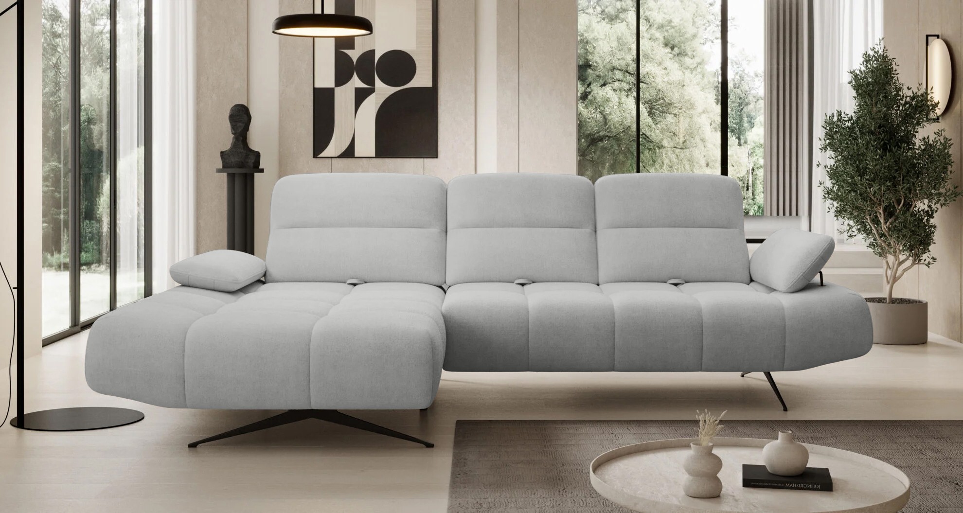 Projektanci postawili na prostotę i funkcjonalność, uzupełniając nowoczesną formę o subtelne pikowania, które nadają meblowi ponadczasowego charakteru.